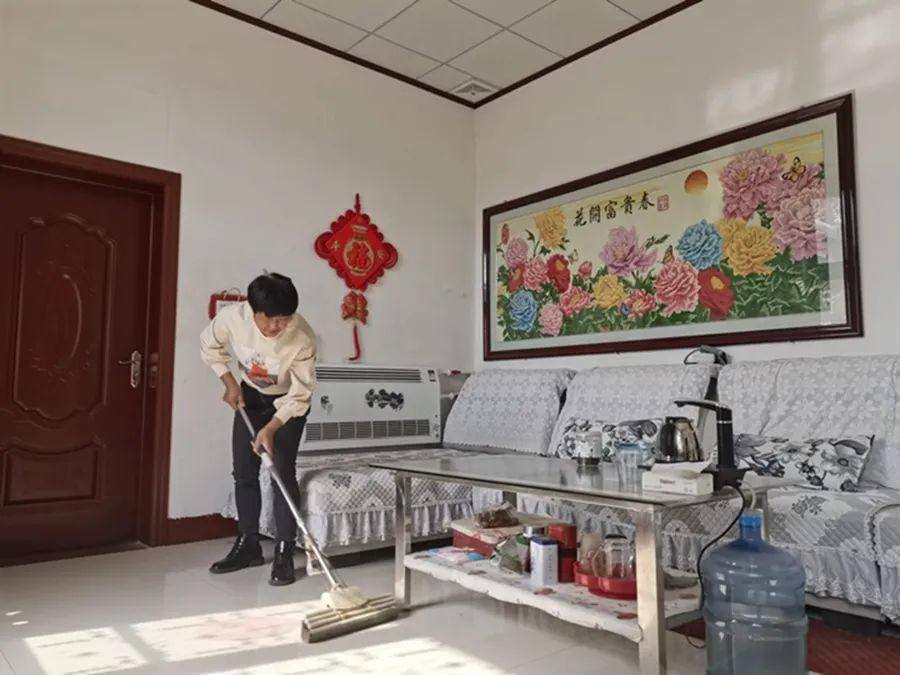 10月24日,邱瑞东的妻子邱志芬在打扫客厅。新华社记者 杜一方 摄