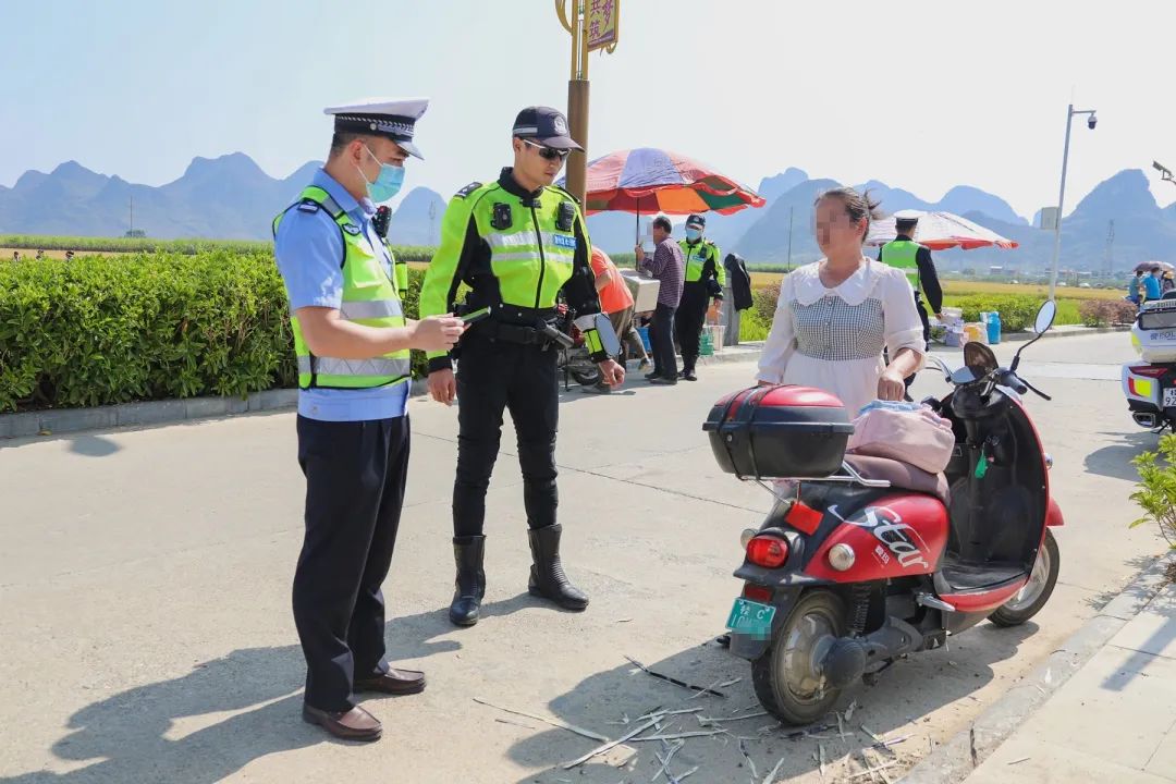 当下正值丰收的季节,从周边村屯前来游玩的村民众多。柳州交警在违法整治时也不忘宣传交通安全,根据农村地区村民交通安全意识薄弱的特点,民警向村民、摊贩发放了“两电”知识、“酒驾成本”等相关宣传资料,嘱托村民将安全知识牢记心间。