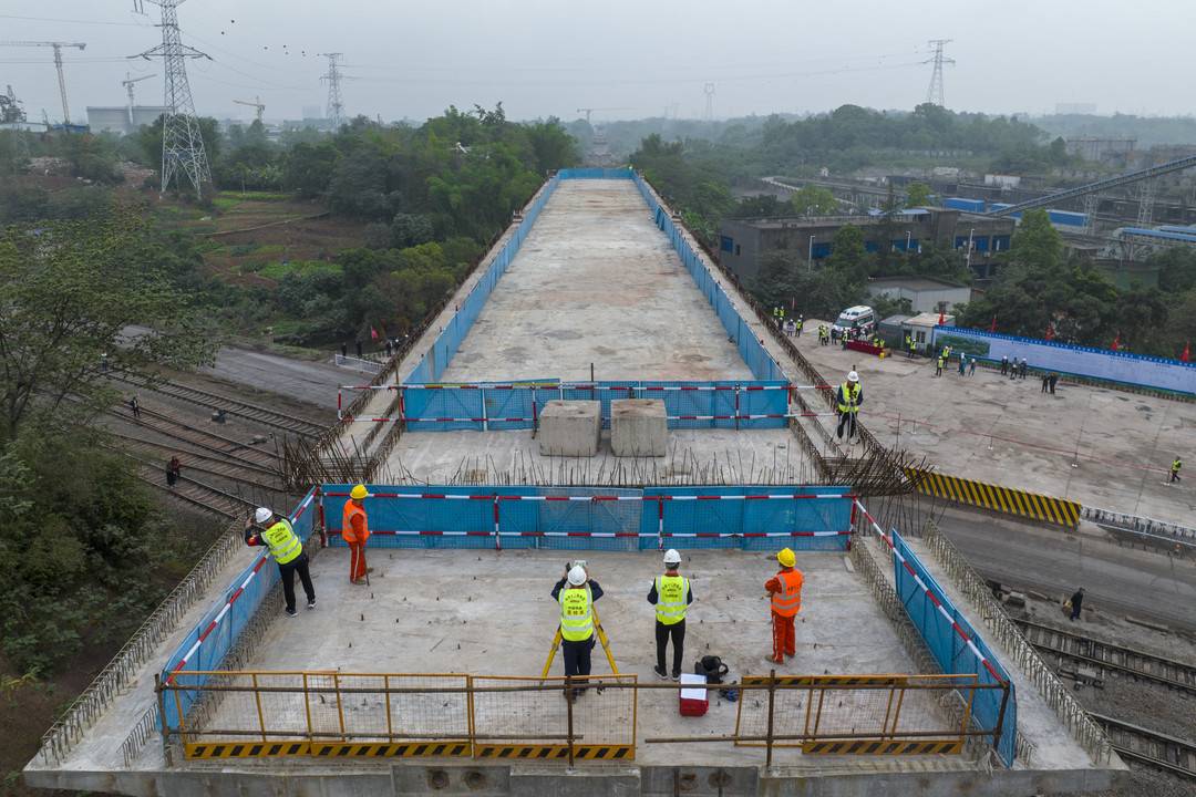 据中铁十二局渝昆高铁川渝段站前三标二分部项目技术负责人徐起介绍,新建渝昆线与既有隆黄线交叉,位于安宁火车站附近,属于运行繁忙路段。采用转体施工方案具有干扰小、安全性高的特点,已成为跨越繁忙交通线的首选。转体施工时需要先预制好高13.5米、长94米的“T”字形的墩身桥梁结构,然后借助桥墩底部的球铰装置,在近2个小时的铁路“天窗”作业时间内,借助“北斗”导航精准定位,使用液压系统等辅助设备缓缓转动桥梁,使之与相邻桥面吻合,紧接着封闭转盘处钢筋混凝土,待龄期到达后,开始边跨合拢段施工。