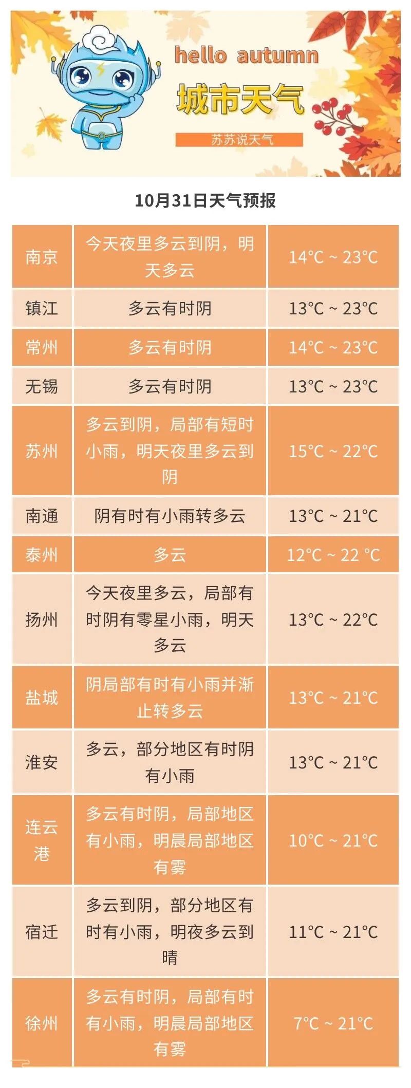 全省多云到晴。最高温度:淮北地区18~19℃,其他地区21℃左右;最低温度:淮北部地区9℃~10℃,沿江和苏南地区12~13℃,其他地区11℃左右。