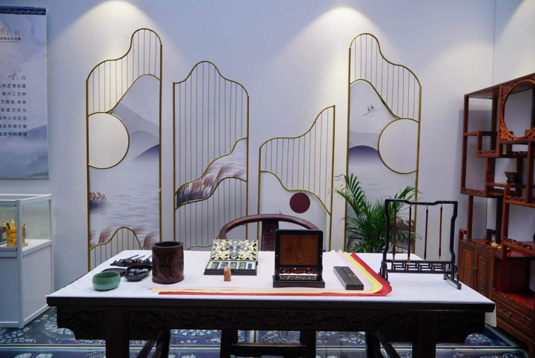本次精品展一大亮点就是在展馆内营造还原了徽州书房的真实场景,极具氛围感地展示了徽州人文的厚重内涵和特色气韵,在纸墨飘香中给予参观者更具直接的观展体验,不用亲临徽州,也能感受到徽州传统工艺的独特魅力和徽匠精神。