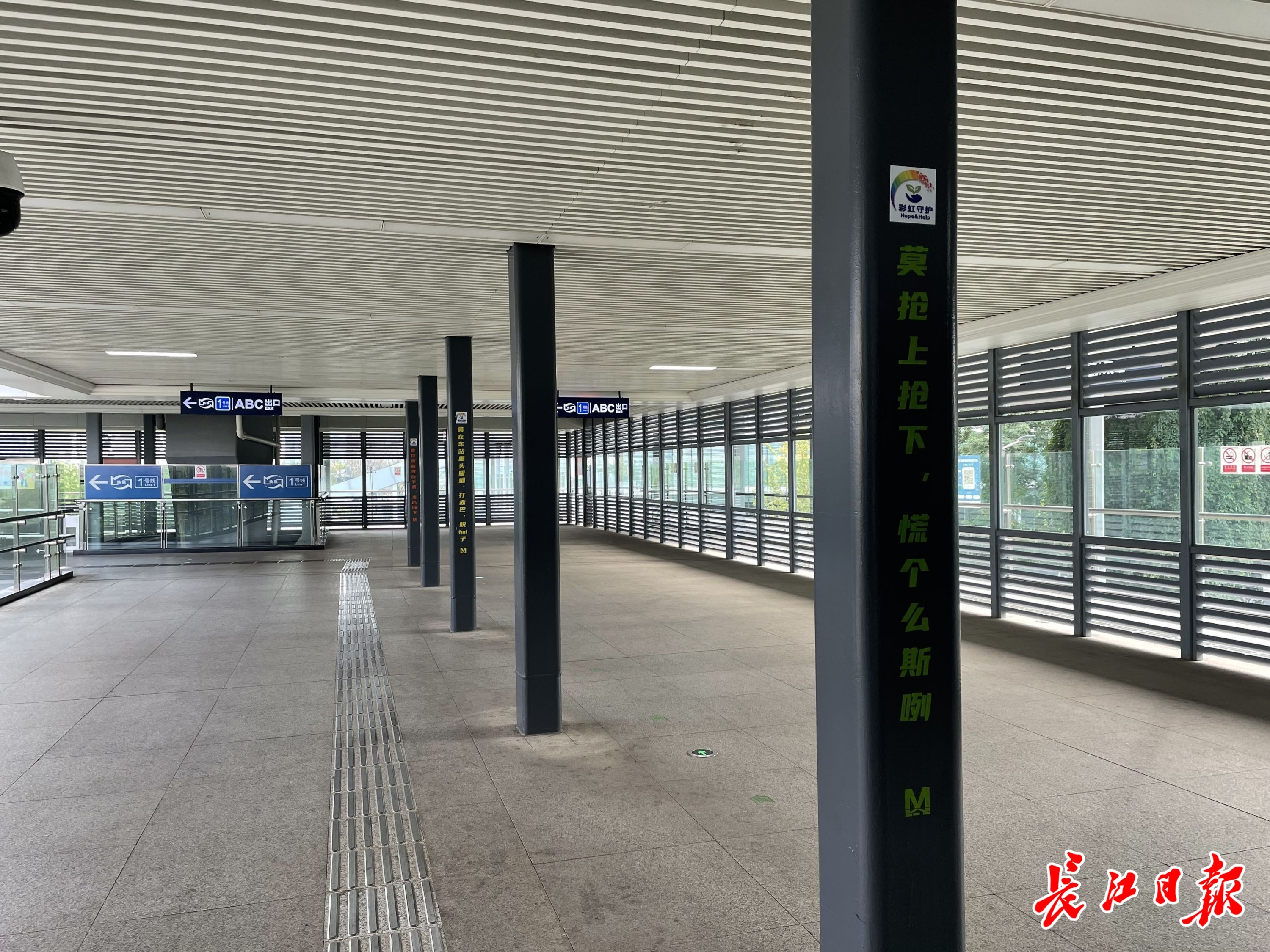 该站工作人员介绍,三阳路地铁站是一个换乘站,在三阳路和京汉大道交叉口上方,有一条较长的过街通道。约2个月前,该站自行在通道内的柱子上,用武汉话做了一些关于日常乘车、候车的提醒,还做了一些图案进行点缀。“内容是大家集思广益的,用武汉话是我们觉得会比较有趣味性,提醒乘客的同时也营造一个活泼生动的氛围,标语的确吸引了不少乘客的目光,经常有人仔细查看。”