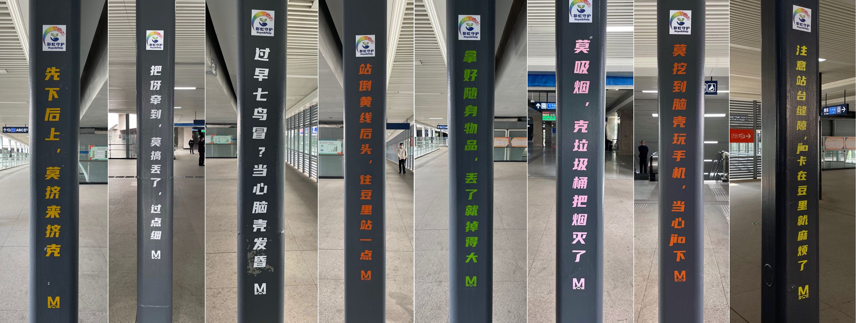 30日中午,记者在三阳路地铁站轨道交通1号线站台下方的一条通道里见到了这些温馨提醒。通道内有一些金属材质的柱子,约10多根柱子上贴有提醒语,提醒的文字采用了黄、红、白、绿等颜色,让灰色的柱子看上去生动了许多。
