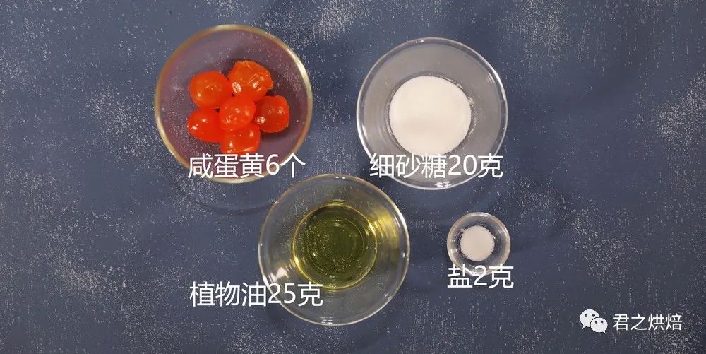咸蛋黄酱配料表:咸蛋黄6个,细砂糖20克,植物油25克,盐2克