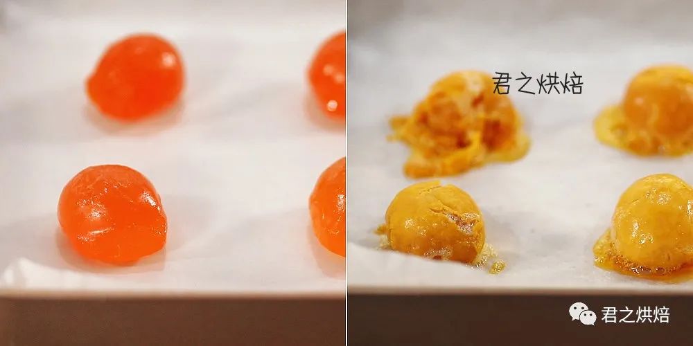在烤盘里铺一张油纸,将生的咸蛋黄铺在油纸上。放入预热好上下火180℃的烤箱,烤15分钟左右,将它完全烤熟。