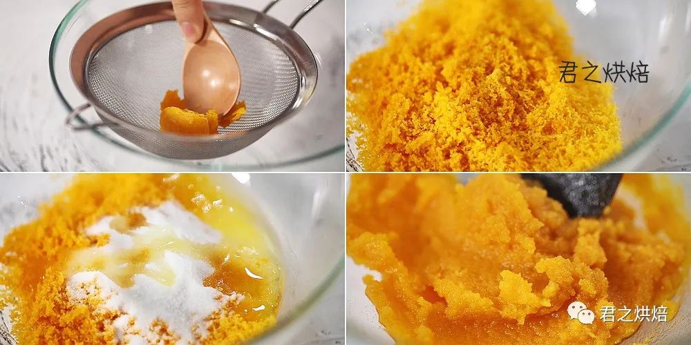 冷却以后的咸蛋黄,用筛网细细过筛,使它成为非常细腻的质地(这一步会稍微费一点儿功夫)。