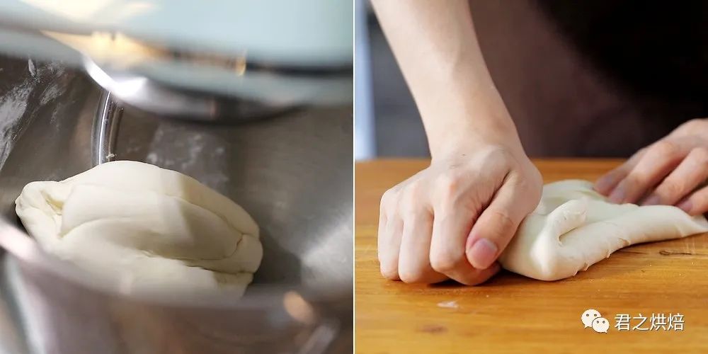 如果没有厨师机,将面团在案板上用力揉15分钟左右,直到面团光滑有弹性(图右)。