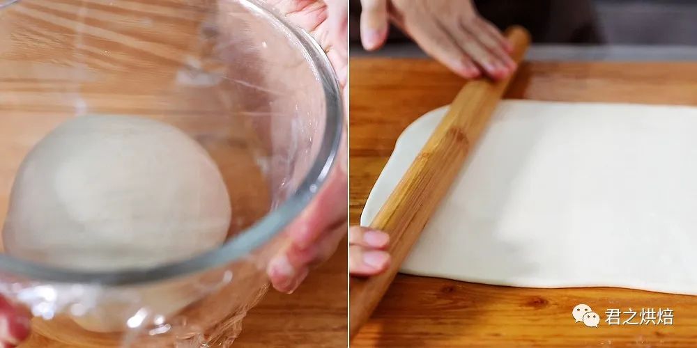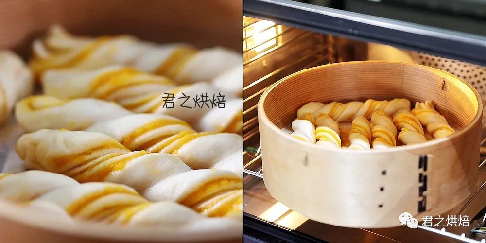 我们要将面团放在温暖湿润的地方发酵。如果你有君焙蒸烤箱,可以直接用蒸烤箱的发酵功能,35℃大约需要发酵30分钟左右。也可以放在加了热水的蒸锅中发酵。