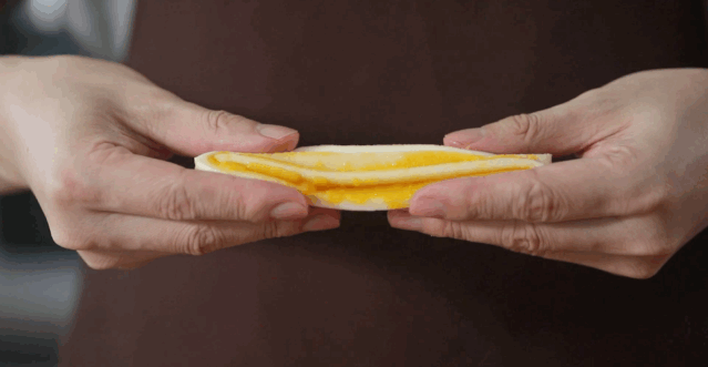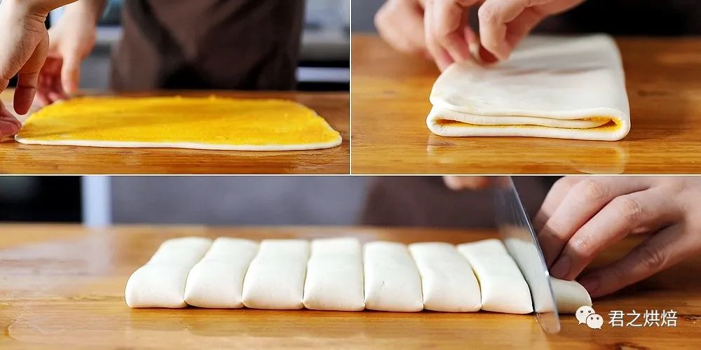 将咸蛋黄酱涂抹在面团表面。要充分涂抹均匀,然后将面团进行三折。