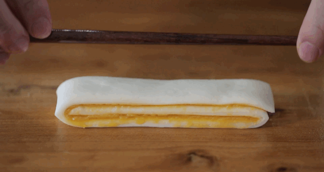 取一个切好的小段,用筷子从中线压下去,要压到底。