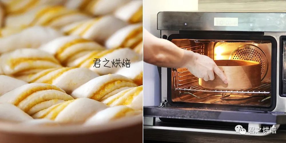 接着就可以蒸了。蒸烤箱用大蒸汽功能先预热5分钟,将花卷放入,蒸15分钟即可。如果你没有蒸烤箱,可以用蒸锅上汽后大火蒸15分钟。