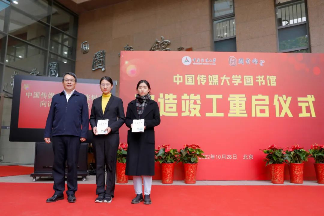 10月28日上午,钢琴湖畔枫叶正红,图书馆门前红毯铺地,中国传媒大学图书馆改造竣工重启仪式在此举行。党委书记廖祥忠总结讲话并宣布全面恢复开馆,校长张树庭向读者正式发布了《中国传媒大学图书馆读者手册》。其他校领导,各教学科研单位负责人,相关职能部门、直附属单位负责人,师生代表和施工方代表共同参加重启仪式。仪式由校长助理王志主持。