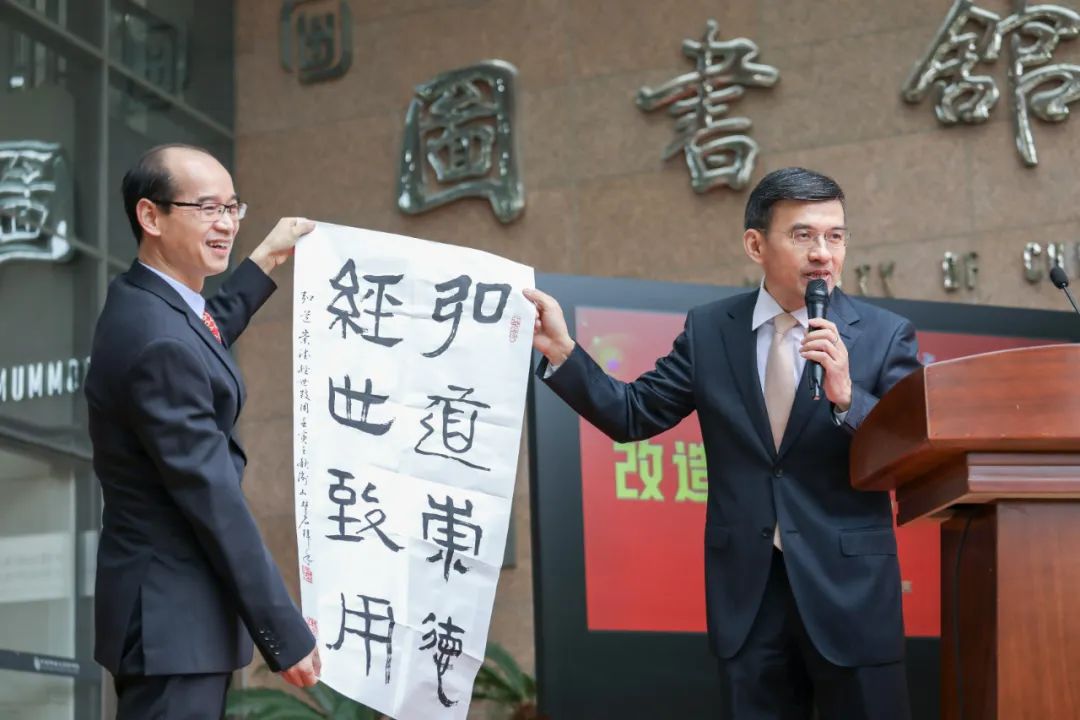 校长助理王志在主持仪式时对图书馆升级改造工作表示充分赞赏与肯定,强调要按照校领导的要求持续加强后续图书馆文化空间建设,打造温馨的读书环境。他还在仪式现场向图书馆赠送了自己的书法作品“弘道崇德 经世致用”。