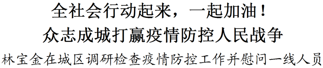 30日,省委常委、市委书记林宝金在城区调研检查疫情防控工作,看望慰问一线防疫人员,强调当前疫情防控形势正处在关键时期、吃劲阶段,全市上下要按照省委省政府部署要求,全面动员起来,积极行动起来,振奋精神、激发斗志,众志成城打赢这场疫情防控人民战争。
