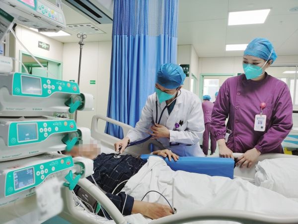 武汉市中心医院后湖院区心血管内科监护室内医生查看患者身体状况。