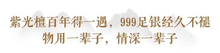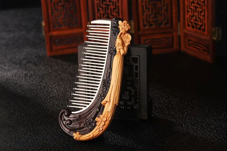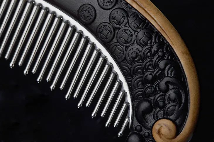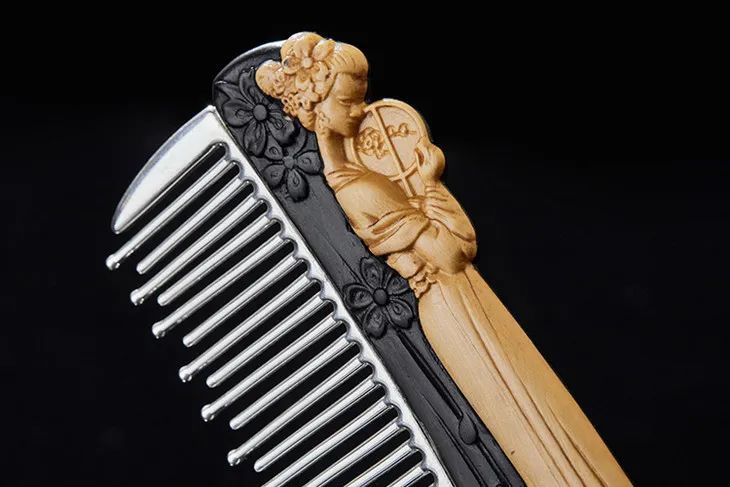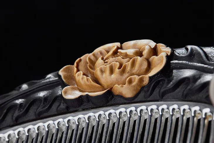 梳柄用珍贵的紫光檀和黄杨木手工镶嵌雕花,梳齿为999足银,既有银的莹泽闪亮,也有木的温润低调,无声无言温柔相待,为你默默梳理万丝情缘。