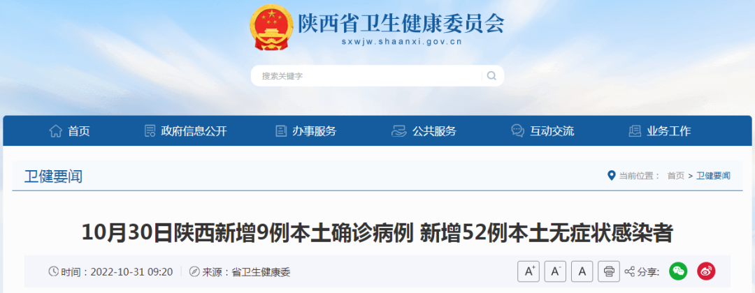 10月30日0-24时,新增报告本土确诊病例9例,其中西安7例(1例为无症状转确诊)、渭南1例、榆林1例;新增报告本土无症状感染者52例(西安24例、宝鸡10例、渭南6例、榆林6例、汉中3例、咸阳1例、商洛1例、延安1例)。出院15例、解除隔离医学观察41例。