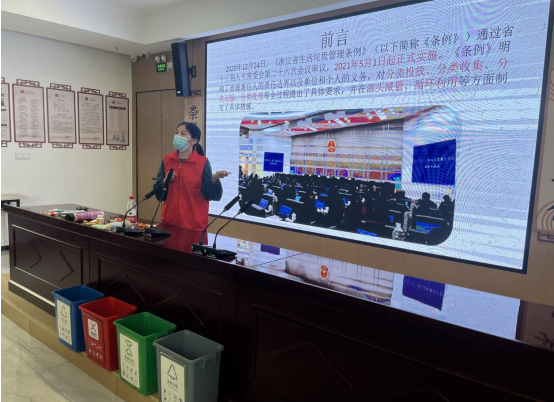 活动中,宣讲员围绕《浙江省生活垃圾管理条例》进行现场宣讲,用自己和团队的志愿服务实践经历为例,通过浅显易懂的语言给居民讲述了垃圾分类知识,从生活垃圾四分类标准、为什么要进行垃圾分类、如何进行垃圾分类以及《浙江省生活垃圾管理条例》责任人制度等四个方面,向居民群众传递了“垃圾分类 从改变习惯做起”的理念。