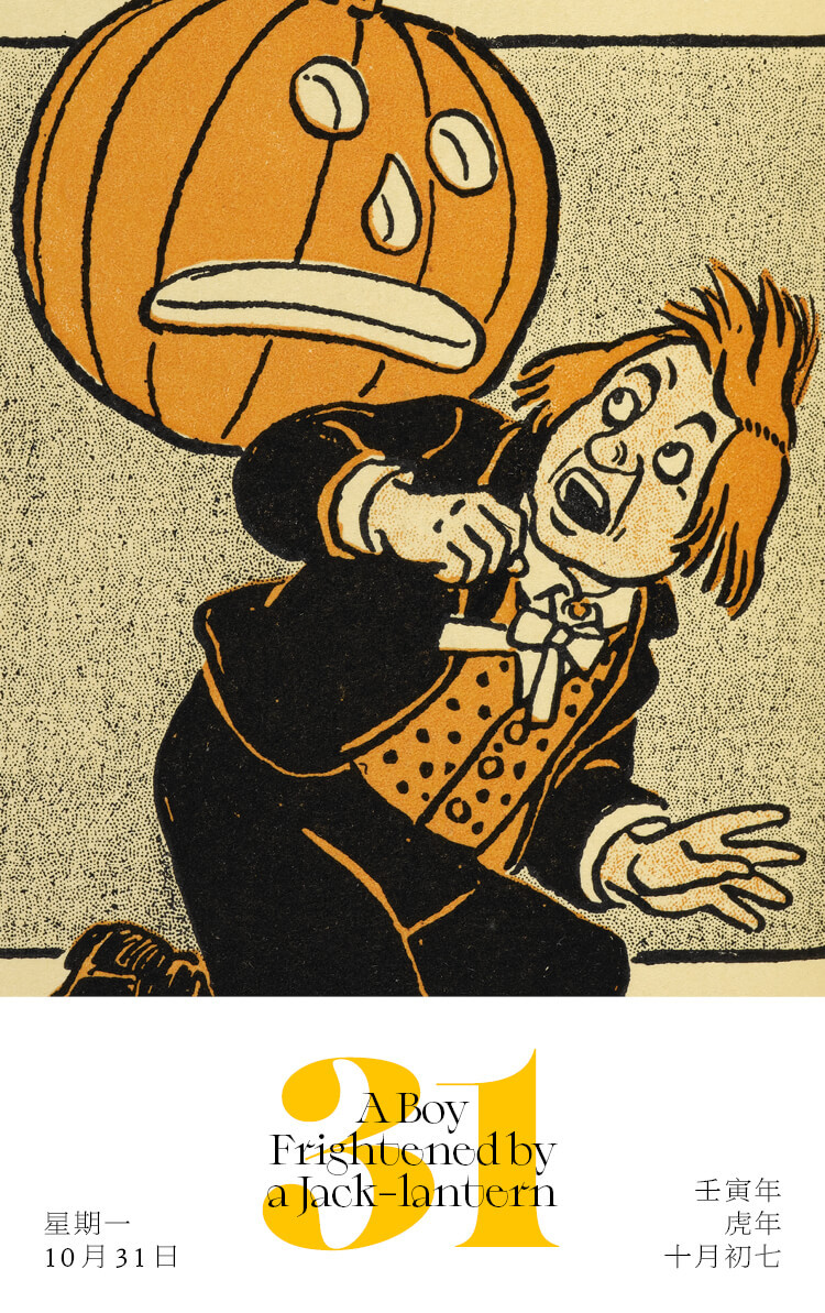 这幅插图出自1904 年出版的儿童读物《珍珠和南瓜》,这本书由保罗·韦斯特和威廉·登斯洛共同撰写,登斯洛还为这本书绘制了插图。这幅画描绘的是一个被南瓜灯吓坏的男孩,只见他蜷缩在地面上,双目圆睁,惊恐地看向身后硕大的南瓜灯。