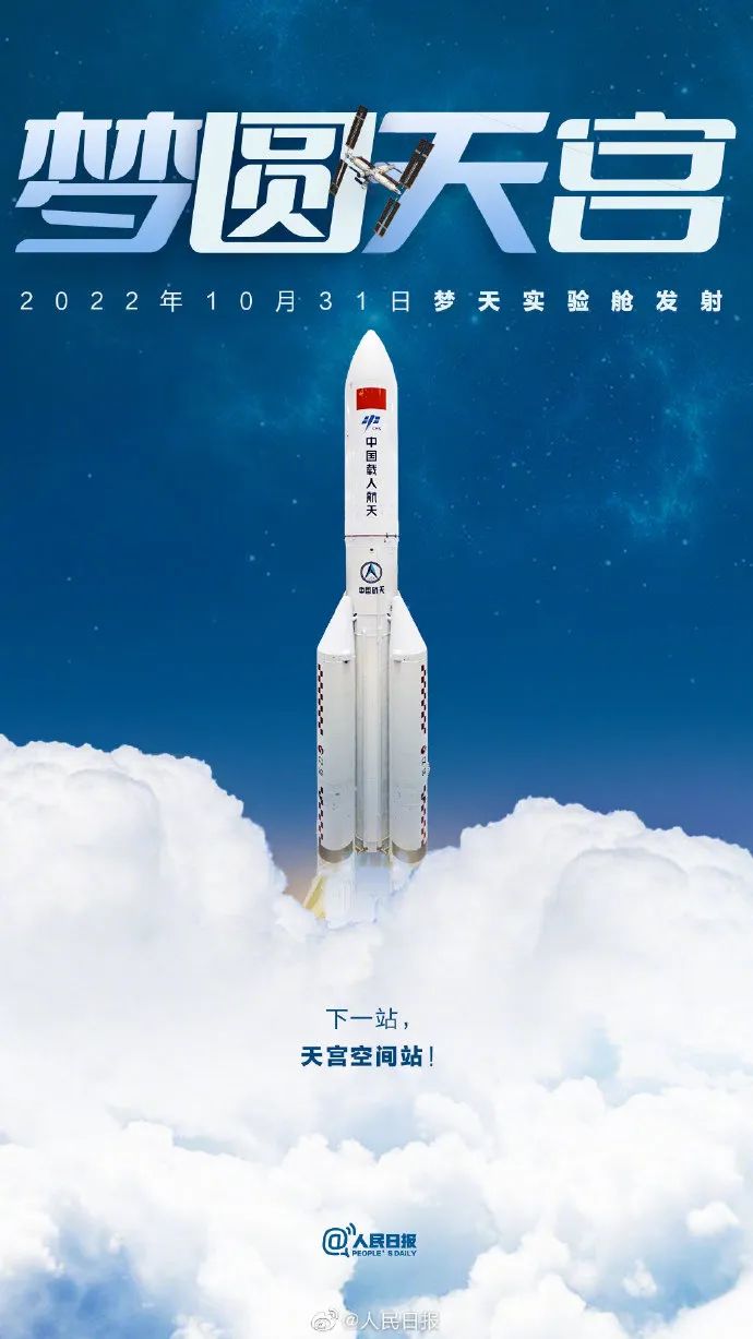 据中国载人航天工程办公室消息,目前,长征五号B遥四运载火箭已完成推进剂加注,瞄准北京时间2022年10月31日15时37分,在我国文昌航天发射场发射空间站梦天实验舱。