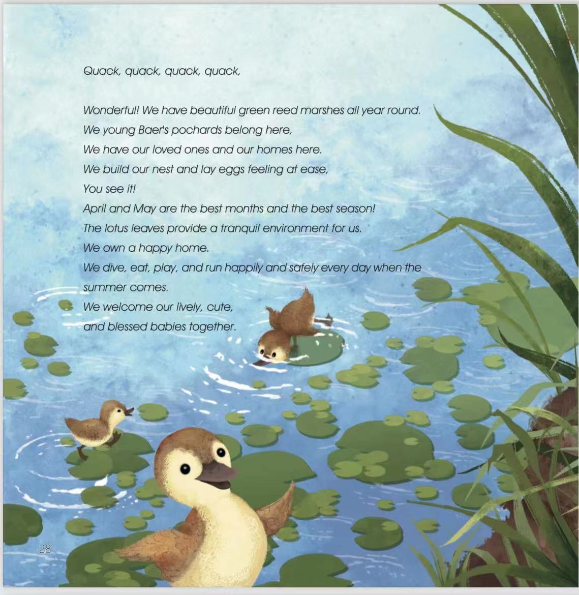 这本绘本名为《嘎嘎嘎,我们喜爱武汉——亲爱的,我们是青头潜鸭》,以武汉青头潜鸭为原型,讲述了全球极度濒危物种、国家一级保护野生动物——青头潜鸭在百湖之市、湿地之城栖息、定居、繁衍的故事。