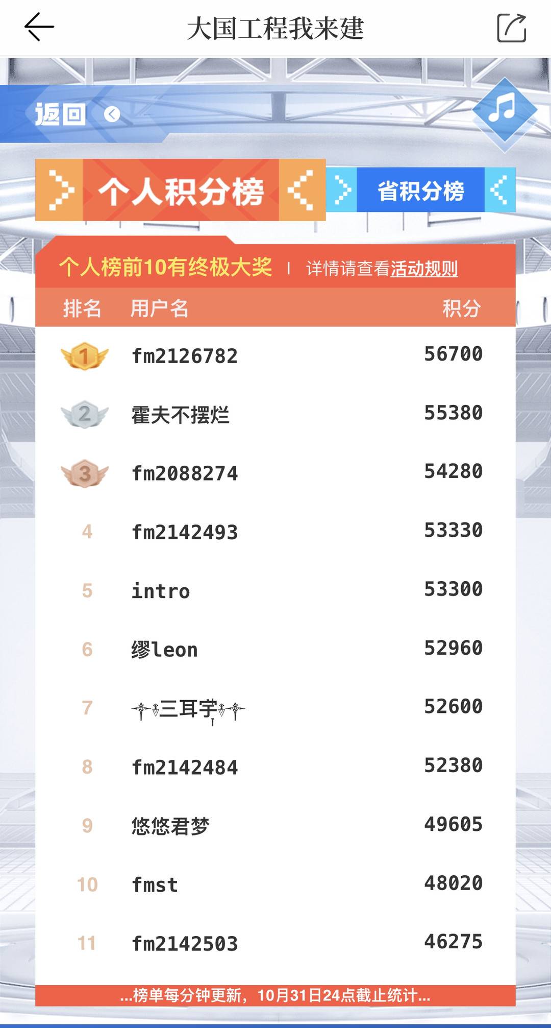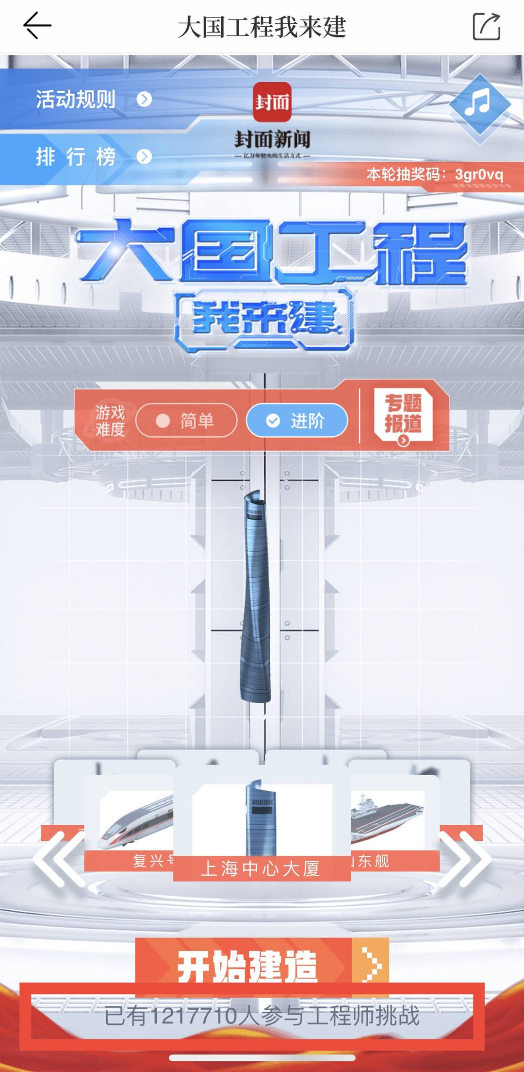指尖争锋,一决高下,就在今晚。由封面新闻重磅推出的3D互动游戏“大国工程我来建”将国家重大工程项目3D建模,形成游戏关卡,以组装零部件的形式让玩家获取积分,赢取大奖。10月31日晚24时,个人积分排行榜将进行总结算,排行榜前十的玩家将获得最终大奖。届时,全国个人积分排行总榜单将最终确定。“大国工程我来建”游戏上线近20天,参与人数超过121万,网络话题讨论近1.5亿人次,包括水利部、交通部等逾一百家大V在线助力。