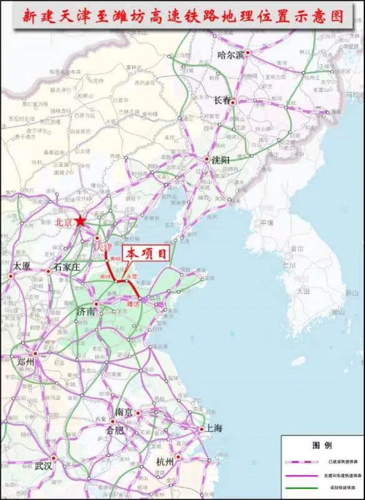 天津至潍坊高铁是国家“八纵八横”高铁网中京沪通道和沿海通道的重要组成部分,也是交通强国山东示范区建设的重大标志性工程。天津至潍坊高铁山东段全长223公里,总投资415亿元,设计时速350公里/时,途经我省东营、潍坊、德州、滨州4市、10个县(市、区),惠及沿线人口1600万人,设无棣、滨州、东营南、寿光东、潍坊北5座车站。该项目是纵贯山东中部的南北高铁出省大通道,项目建成后,将全面结束东营市、滨州市区不通高铁的历史,填补鲁北地区高铁发展空白,对于加快人流、物流、资金流的快速流动,加强我省与京津冀、长三角地区的互联互通,推动山东更好地服务和融入新发展格局,保障黄河流域生态保护和高质量发展等国家重大战略实施,具有重要意义。