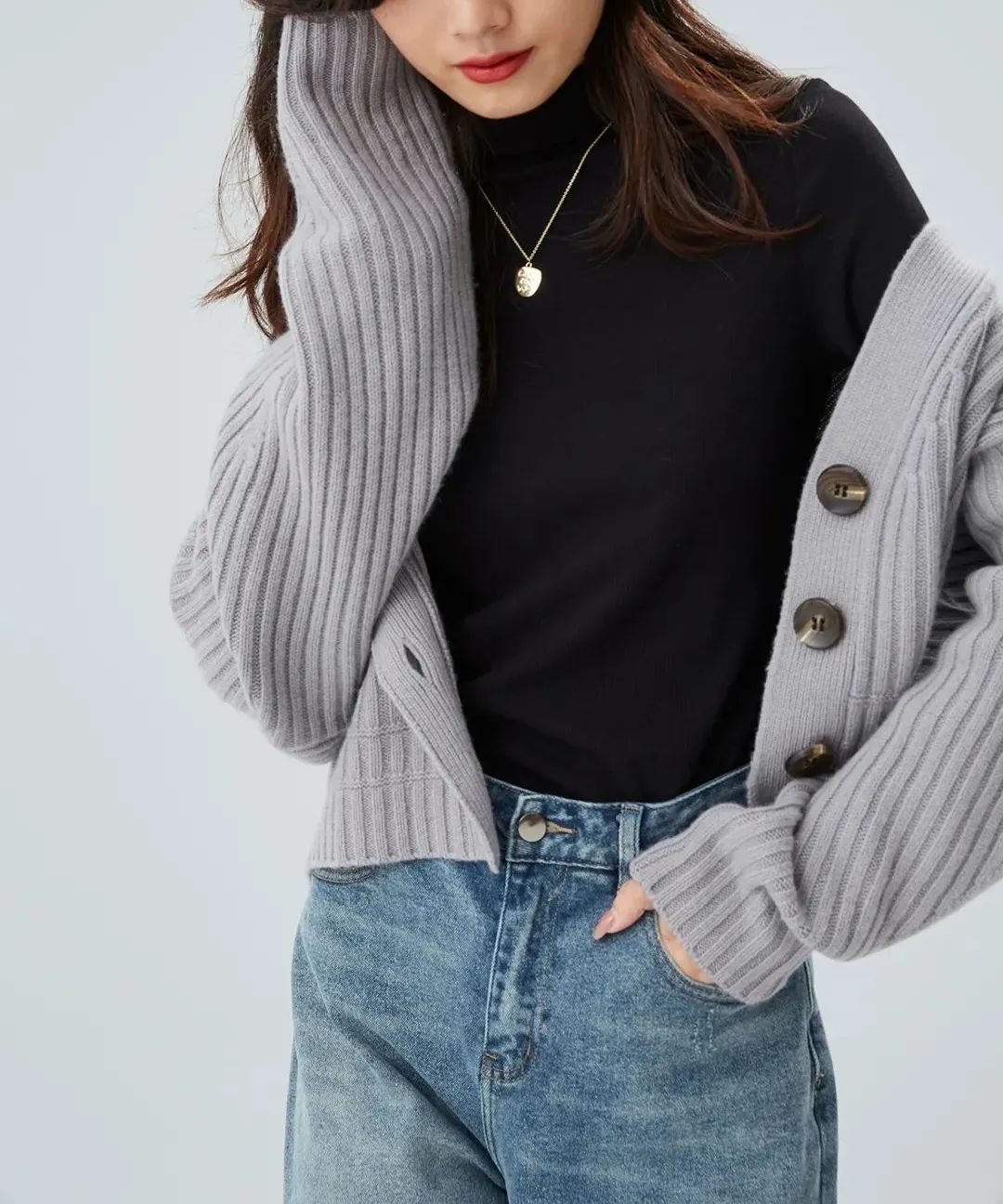 延伸半高领款:领子高度恰到好处,没有束缚感,保暖的同时凸显颈部线条。