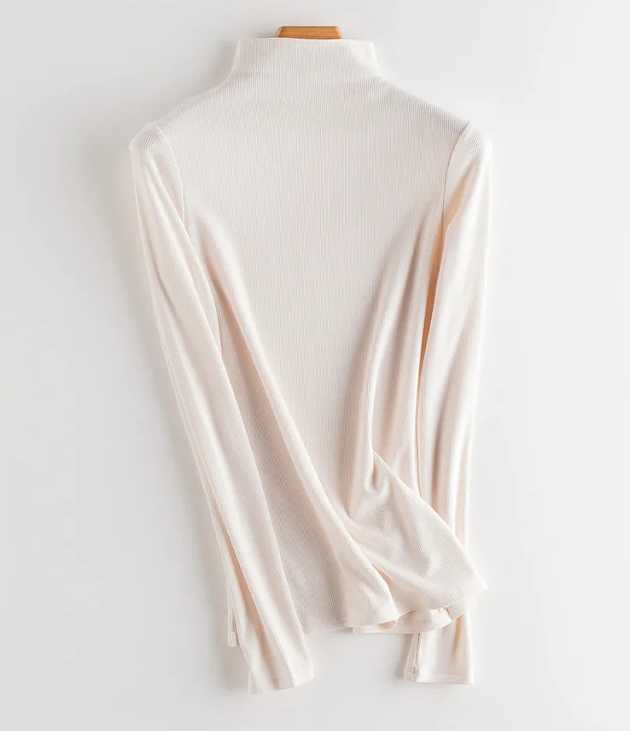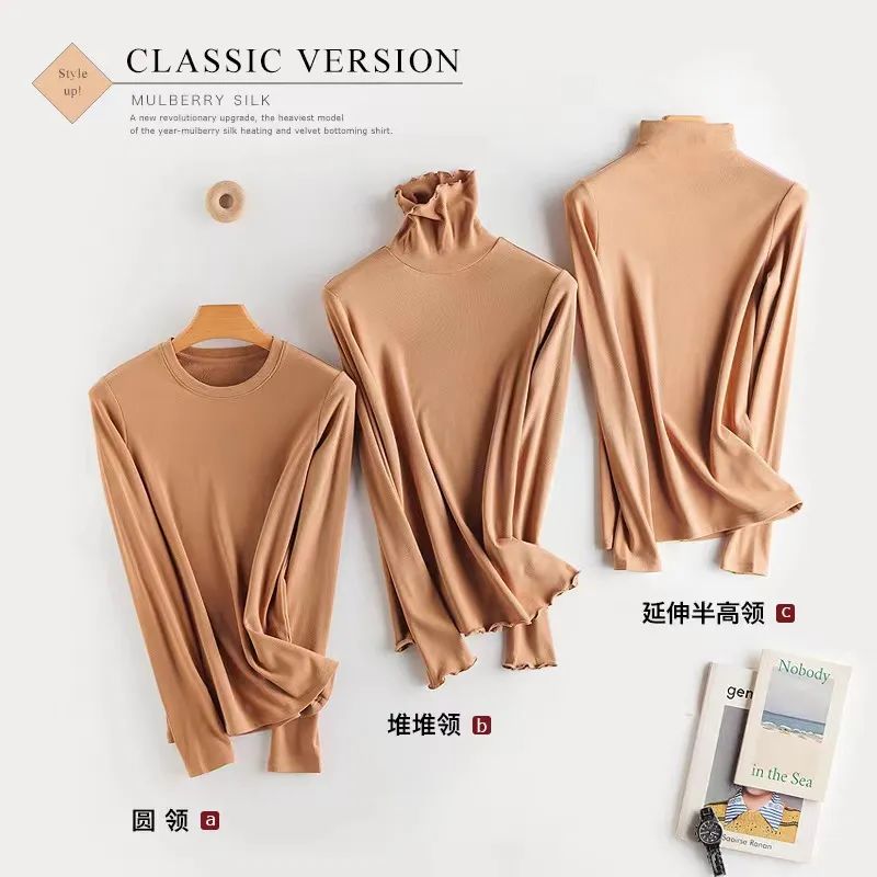 咱们这款桑蚕丝发热打底衫不仅款式优雅大气,它的面料也是温暖、高级又有质感,外在看着色泽光亮,手感顺滑。