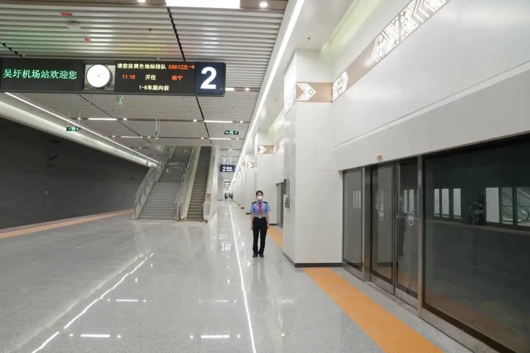 吴圩机场站与城市轨道交通机场站、机场停车库等共同组成南宁国际空港综合交通枢纽。车站位于交通枢纽地下一、二层。地下一层主要为旅客候车厅和换乘中心,地下二层主要为站台层、轨行区,设4条铁路股道,其中2条正线、2条站线。