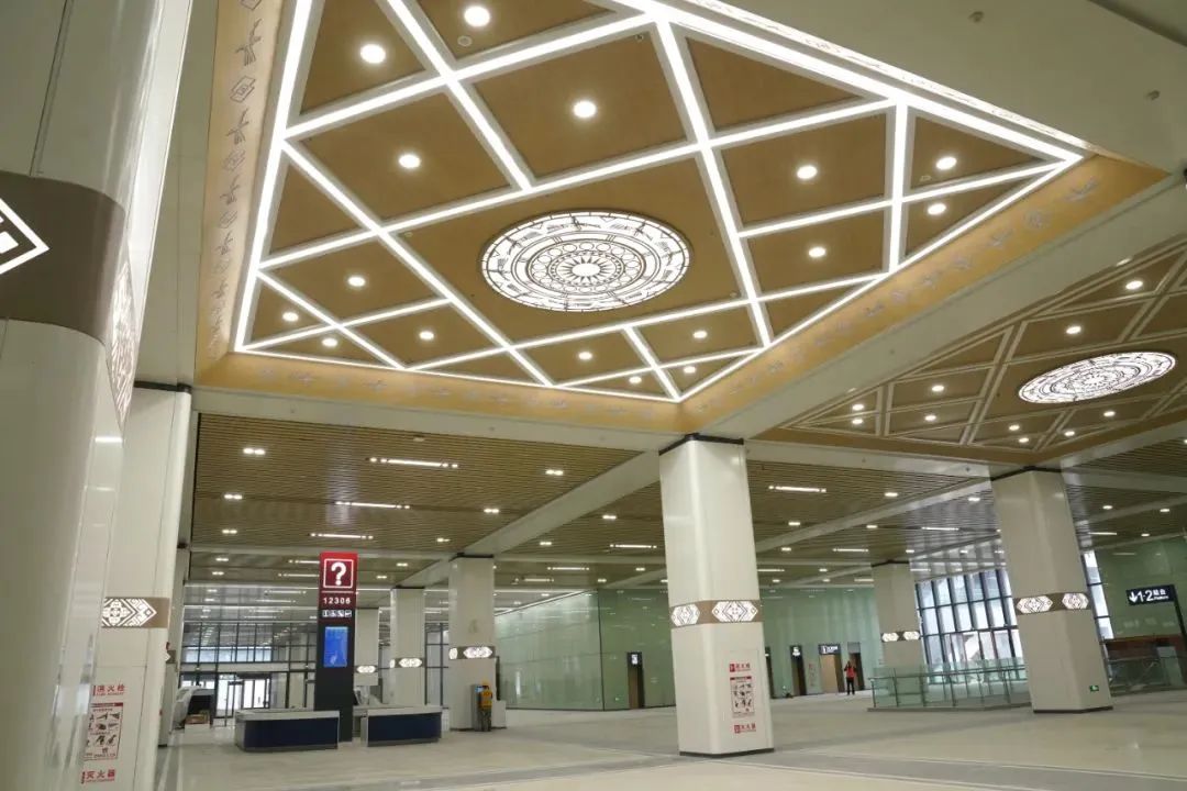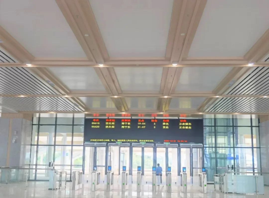 候车厅和站台区域的墙体装饰融入了壮锦元素,装饰风格简洁素雅。