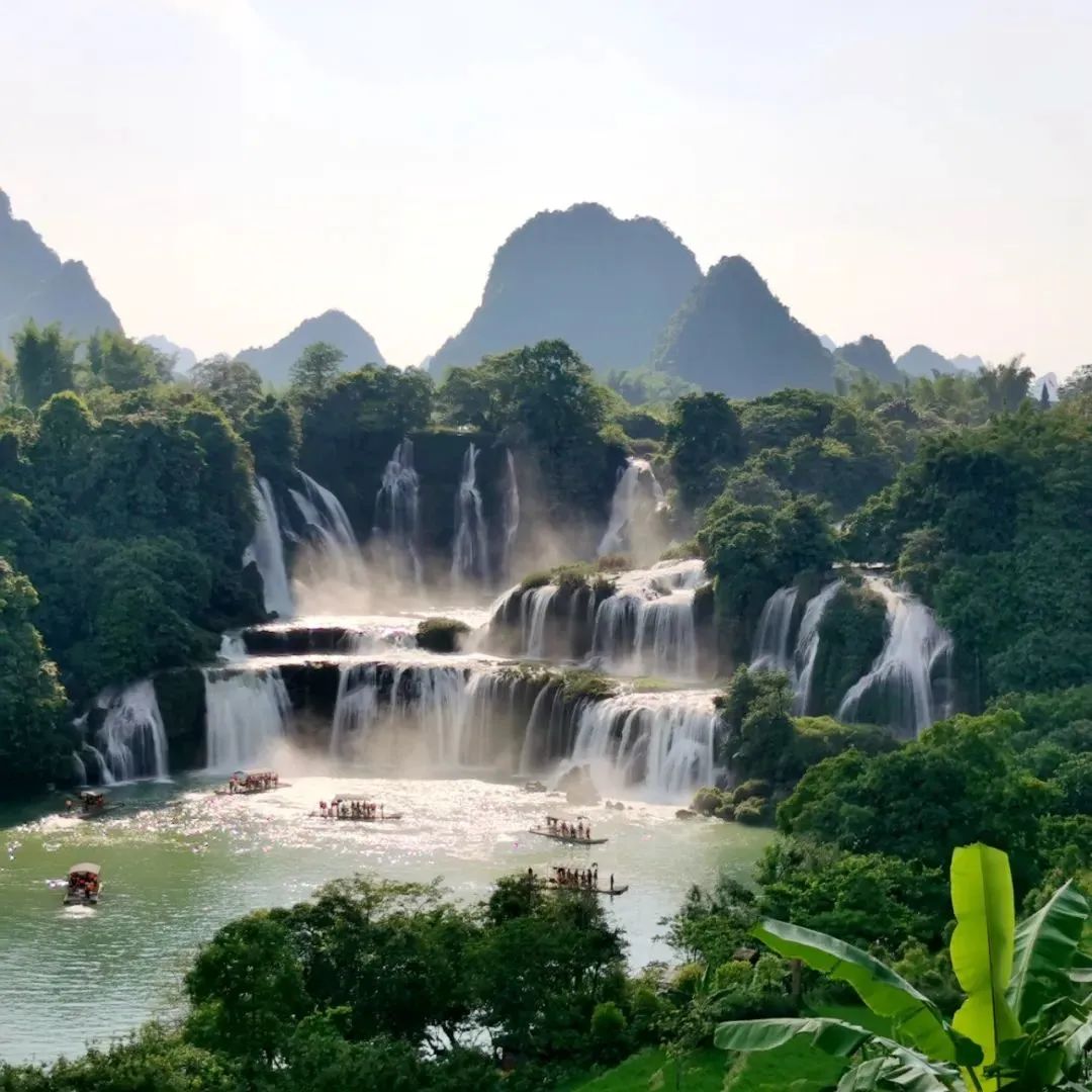 “亚洲第一大跨国瀑布”——大新德天瀑布,江水从60多米高的山崖倾泻而下,水雾弥漫震荡河谷,划开了中越两国的边界,令人叹为观止。