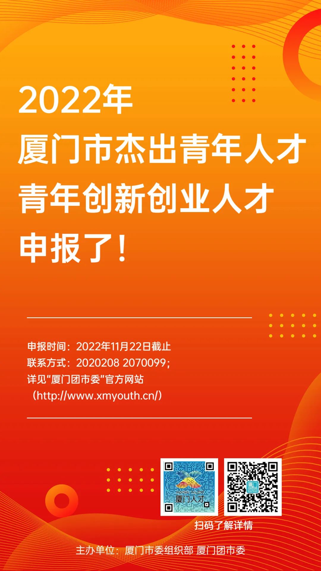 今日起至11月22日,申报人可登录厦门团市委官网,点击“厦门市青年双百人才申报”飘窗或“通知公告”栏目了解申报流程、所需申报材料与申报表格,登录网上申报系统注册登记,同时将相关申报材料的书面版提交至团市委。