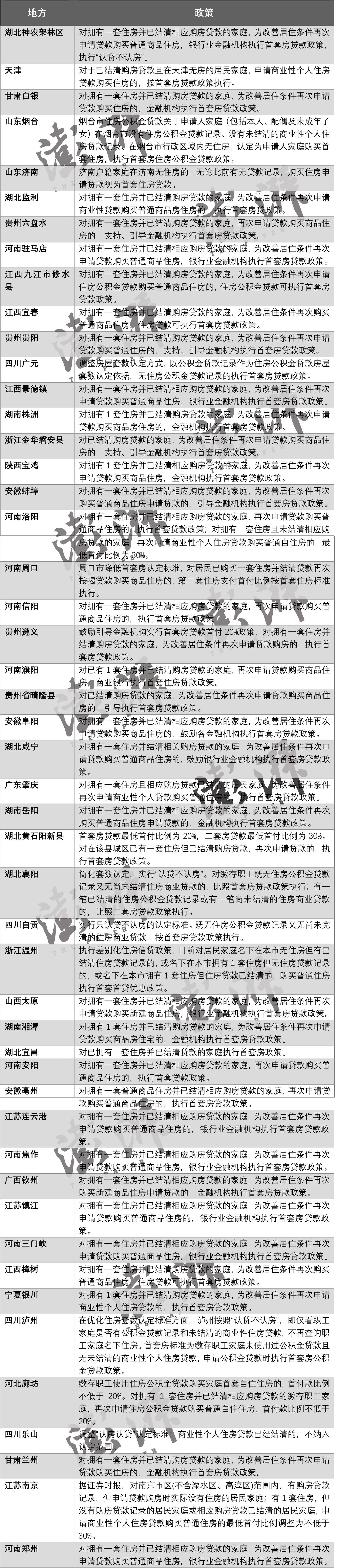 另以湖北神农架林区为例,湖北省神农架林区人民政府印发《关于促进房地产市场平稳健康发展的工作措施》提出,降低商品房首付比例,居民家庭首次购买普通商品住房的商业性个人住房贷款,最低首付款比例由30%降为20%。新政明确,对拥有一套住房并已结清相应购房贷款的家庭,为改善居住条件再次申请贷款购买普通商品住房,银行业金融机构执行首套房贷款政策,执行“认贷不认房”。