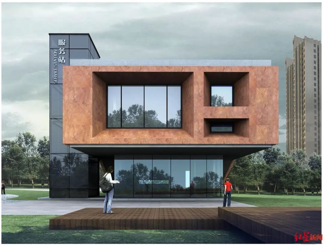 明爱驿:该驿站以轻餐饮为商业业态,营造“城市凉亭”的理念,立面处理借鉴川西民居结构,采用框架结构;建筑色彩采用深褐色,使大自然色彩与建筑浑然一体,突出城市公园的休憩、休闲特点。