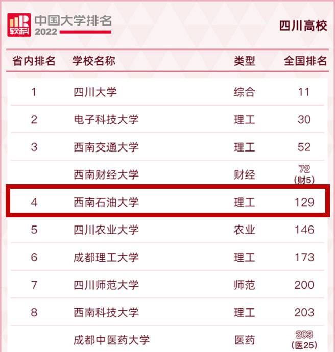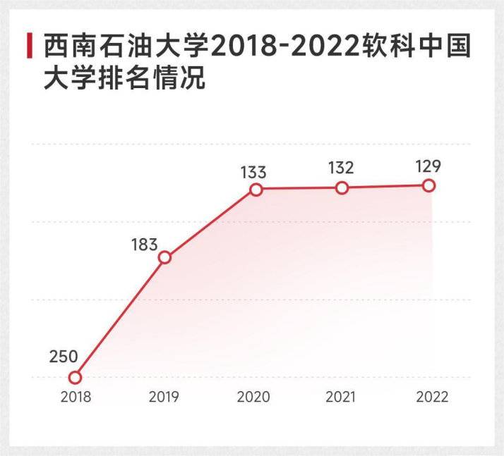 与此同时,学校在综合实力提升上也屡创佳绩,在软科中国大学排名近5年的表现中,西南石油大学已从2018年的全国第250名跃升至2022年的全国129名、四川省第5名,以扎实稳健的步伐,推动学校走向更高更强。