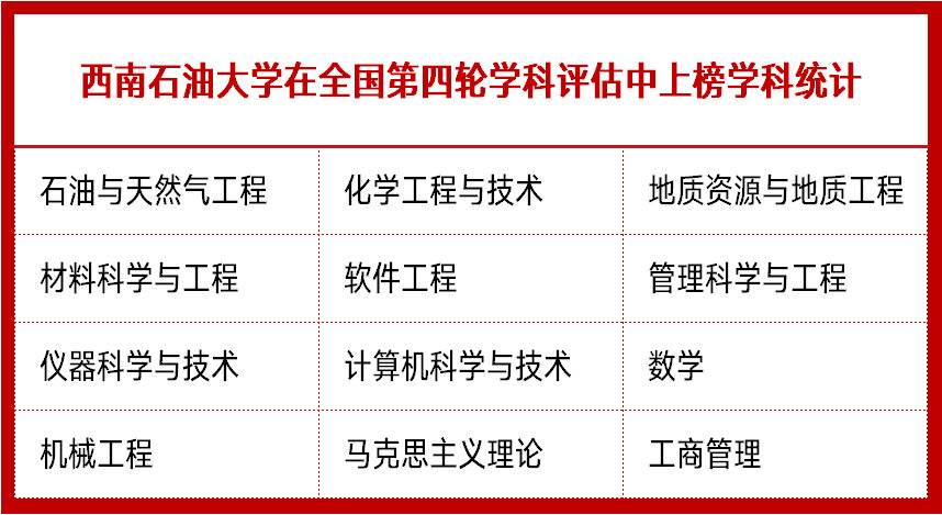 新时代的西南石油大学学科建设成绩显著,以工为主,石油天然气及其配套学科世界一流、多学科协调发展的高水平能源大学和百年名校的学科框架基本形成。