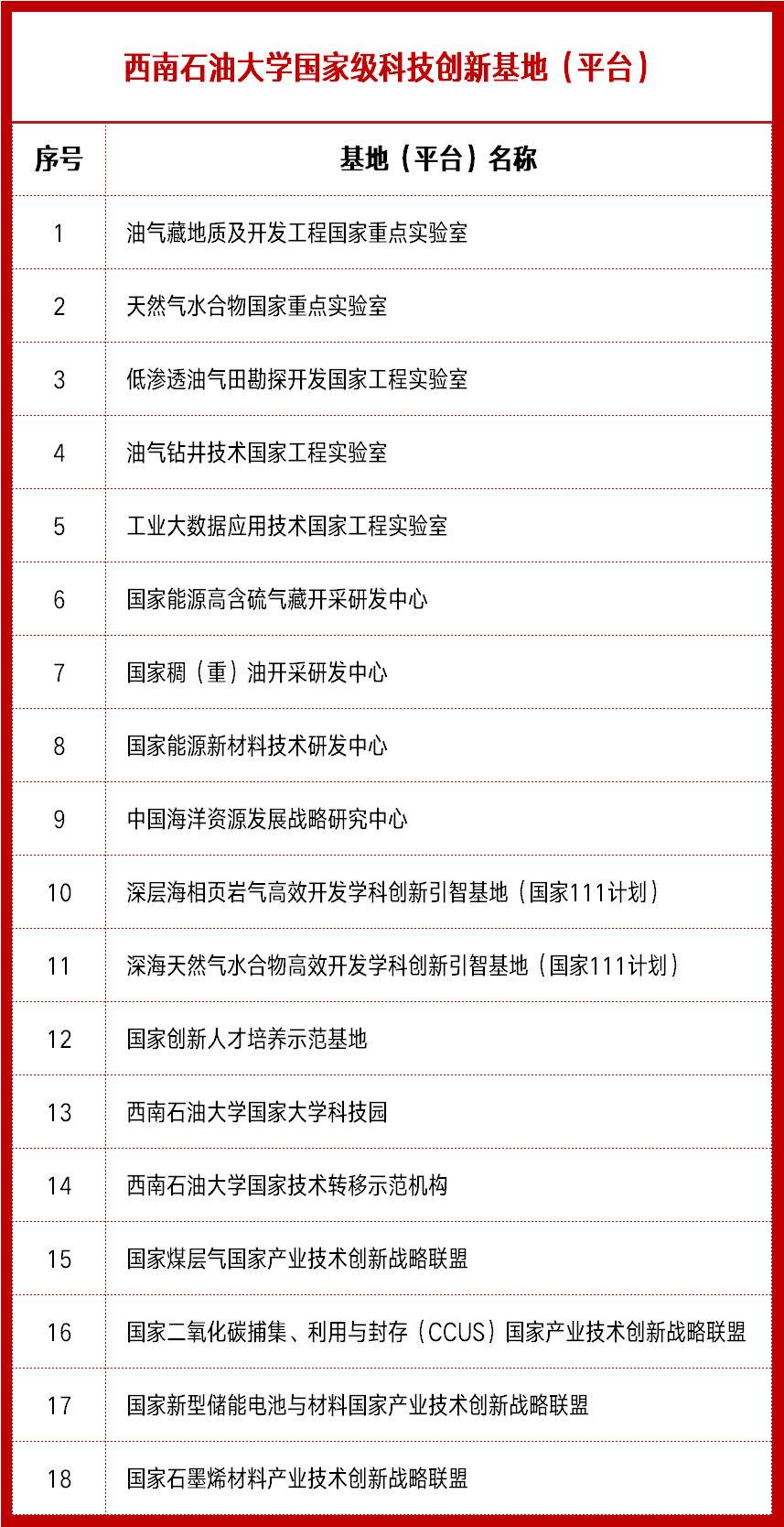 目前学校拥有18个国家级科技创新基地(平台)在内的各级各类科研基地(平台)267个。其中包括油气藏地质及开发工程国家重点实验室、天然气水合物国家重点实验室。
