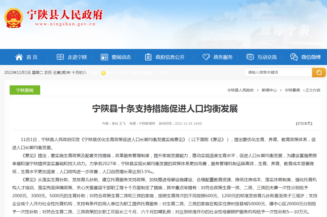 11月1日,宁陕县人民政府印发《宁陕县优化生育政策促进人口长期均衡发展实施意见》(以下简称《意见》),提出要优化生育、养育、教育政策体系,促进人口长期均衡发展。