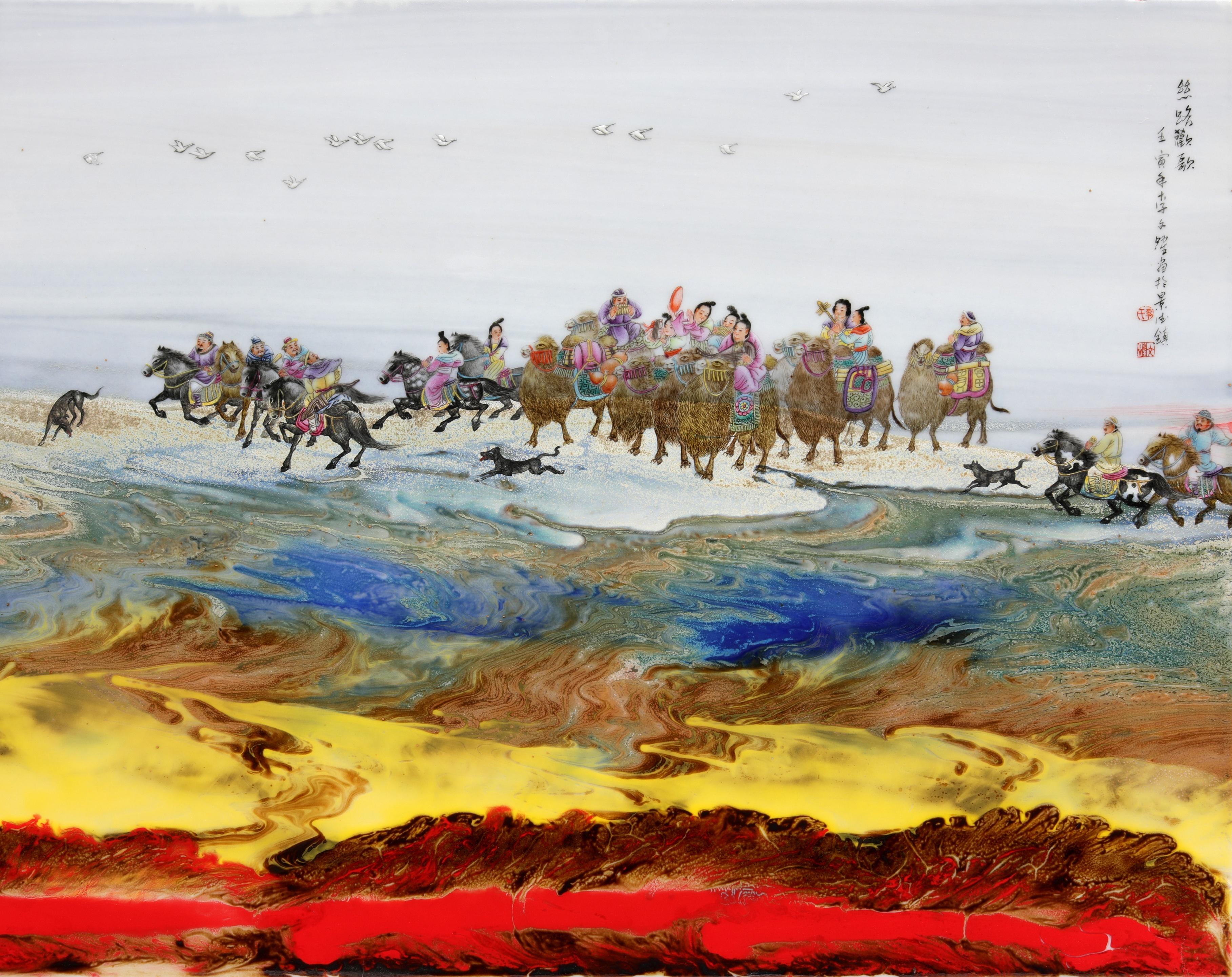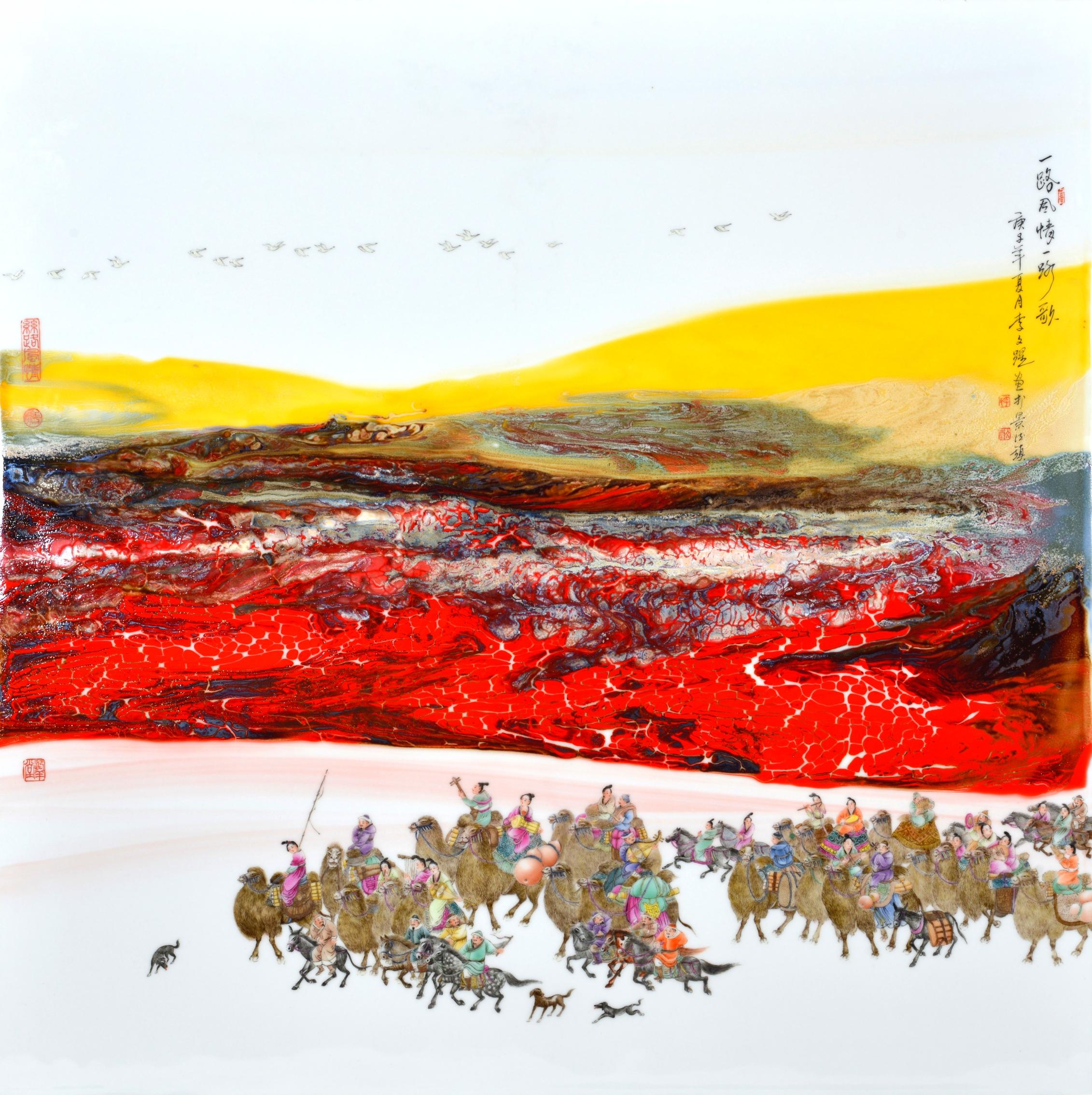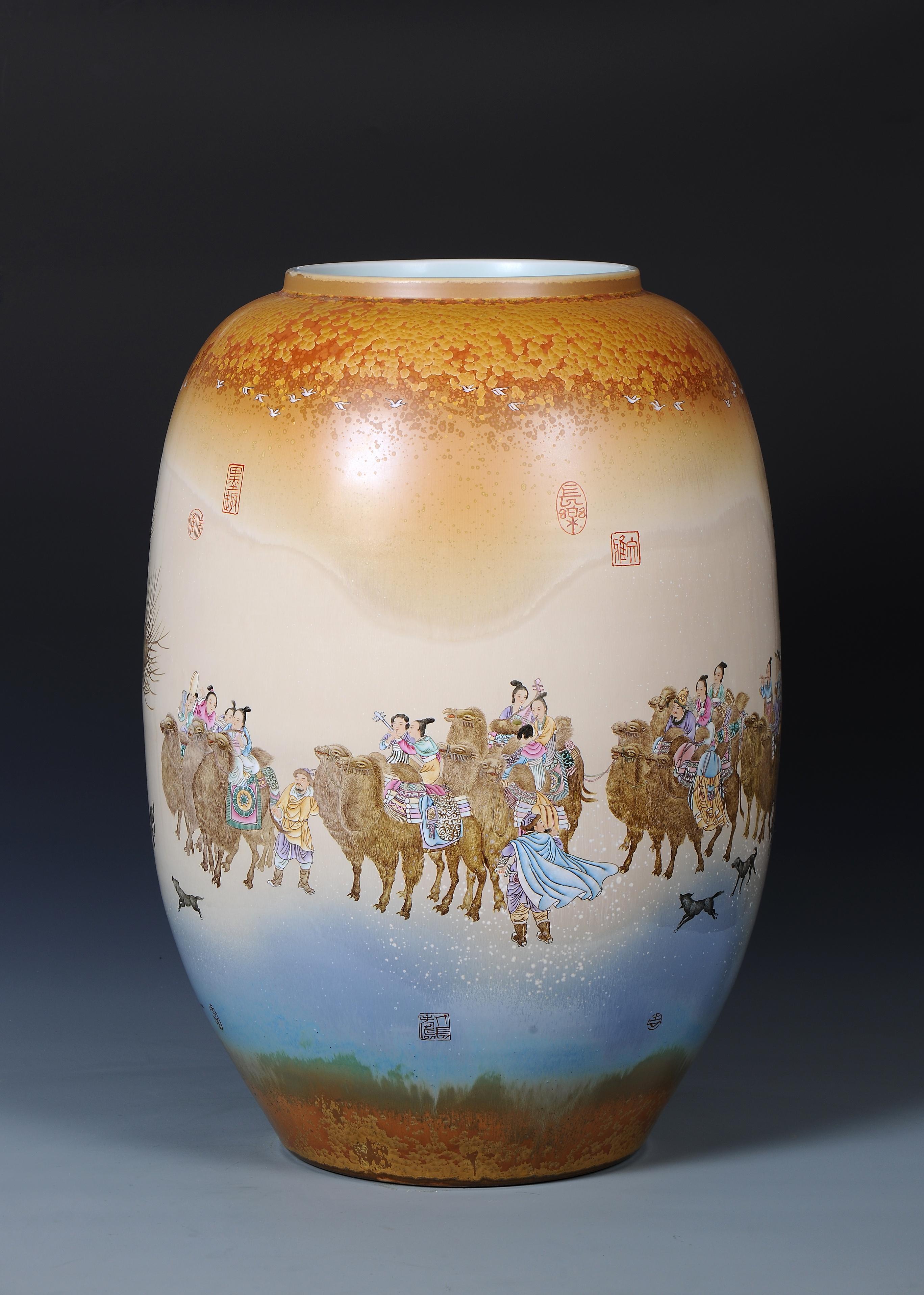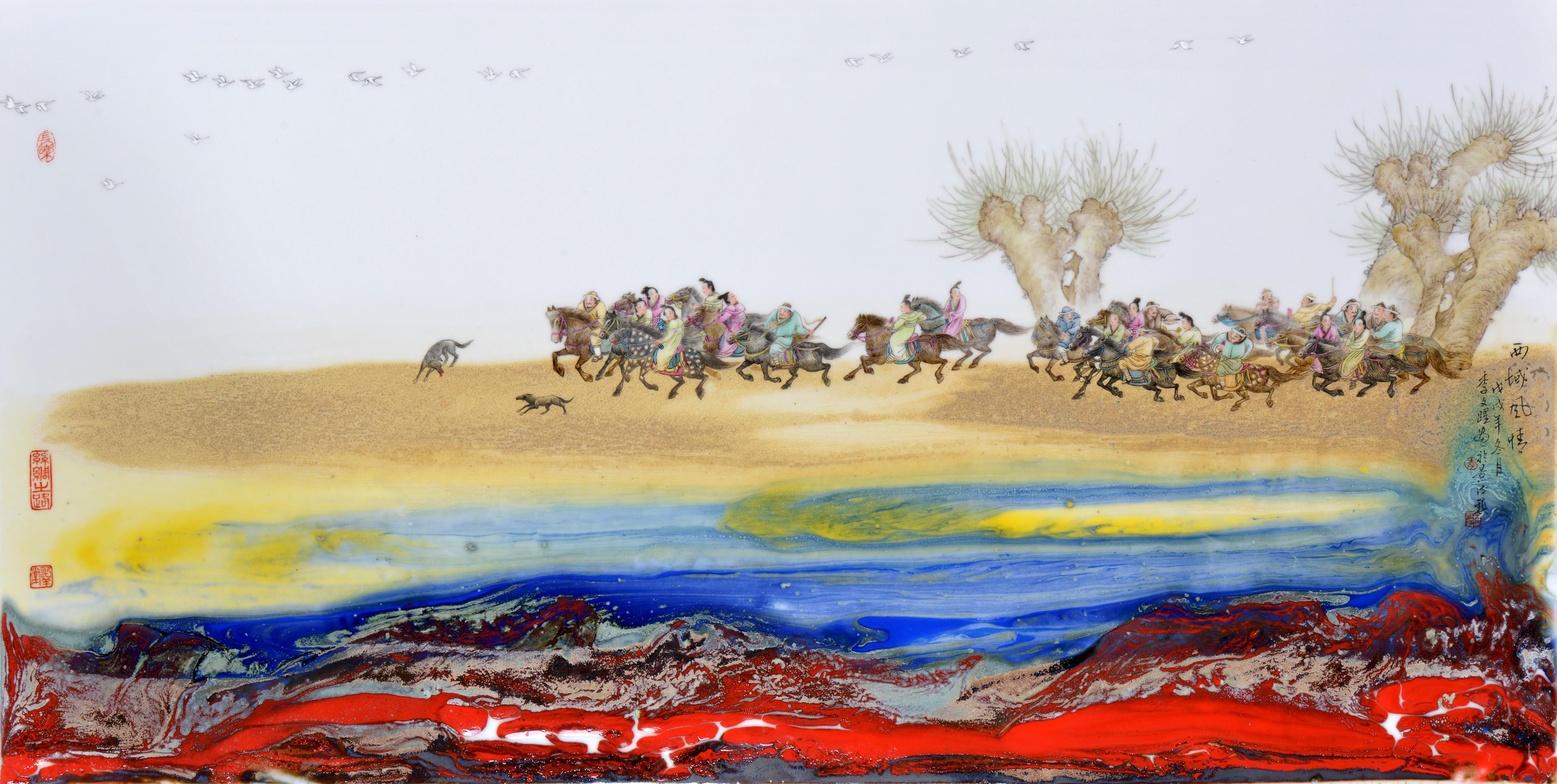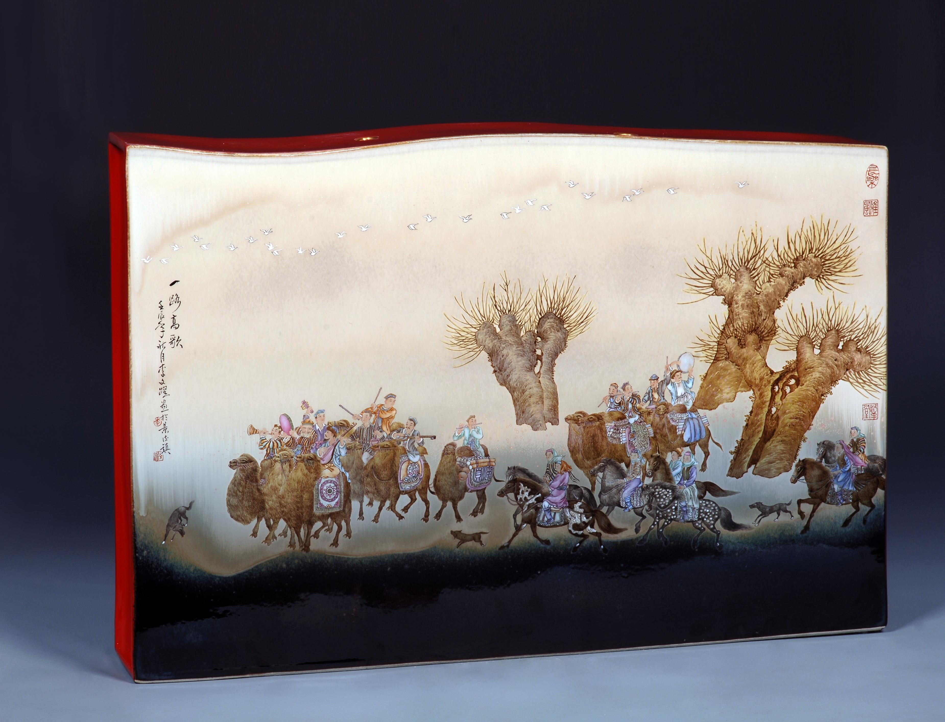 粉彩是景德镇四大传统名瓷之一,中华民族传统制瓷工艺中的珍品,被誉为“东方艺术明珠”。李文跃以其在景德镇艺术瓷厂二十八年探索实践的履历与其2002年作为陶瓷专业技术特殊人才引进江西陶瓷工艺美术职业技术学院任教,一心埋首于粉彩瓷技艺的教学、艺术创作与理论研究。可想而知,当一个人用他生命的大部分时间去苦心经营一门手艺时,这门手艺必将伴随着附着其上的对于生命的探微过程走向一种游刃有余。李文跃在扎根粉彩瓷这个专项领域的探索中,以厚重的积淀自然地抵达了技艺的精微之处。谈到一个艺术家的格局,最终必须回到他自身的创作上来,李文跃不仅在粉彩艺术探索中继承了它本身的深厚传统,同时也创新与拓展了粉彩艺术。早在1987年,李文跃曾拜墨彩老艺人雷火莲为师,从事“墨彩描金陶瓷艺术”特种工艺的创作和研究。经过几年的潜心学习,李文跃在扎实的粉彩技艺之外,又掌握了墨彩技艺。在这两种技艺的自如掌控之中,李文跃在继承传统的基础上有了自己的全新思考,他试图将粉彩装饰粉润柔和之秀雅与墨彩瓷绘艺术典雅清和的艺术特色融于陶瓷绘画表达中,创新并丰富了陶瓷绘画的语言,在传统粉彩瓷艺术的基础上开创了“粉墨彩瓷”艺术新语言,这种创新是他个人所独有的,成为他个人鲜明的艺术符号。论及艺术,必须要有思想的渗透引领艺术走向灵魂的升华,而思想应该说是一个人格局的核心。可以说,李文跃在创作中所显露的人文情怀是显而易见的。这种人文情怀的表达在陶瓷绘画创作中几近呈现出史诗的气象,对传统文化的深研使其在创作中显示出对历史与人文的反顾,并且试图在历史与当下的链条上找到能给予人启迪的衔接点。我们可以看到李文跃的创作根基中,内蕴着一种文人的气度与追根思源的回溯精神。从他深入传统的普遍的引经据典到将“孔子”文化作为一个独立题材来创作再至其西域系列题材作品的创作,无不显示出他在传统文化的浩海中所撷取的经典关联,可以说,李文跃都是紧紧环绕着我们本土文化中至关重要的部分来进行系统地关联地诠释。