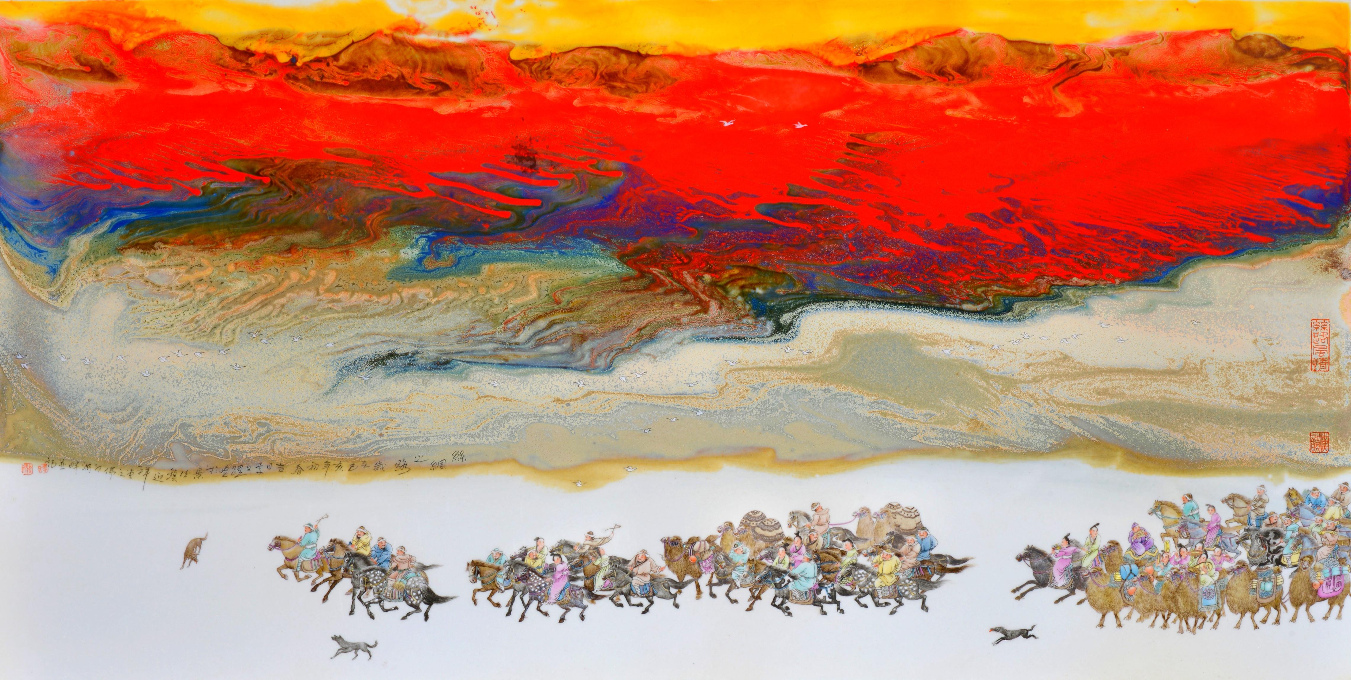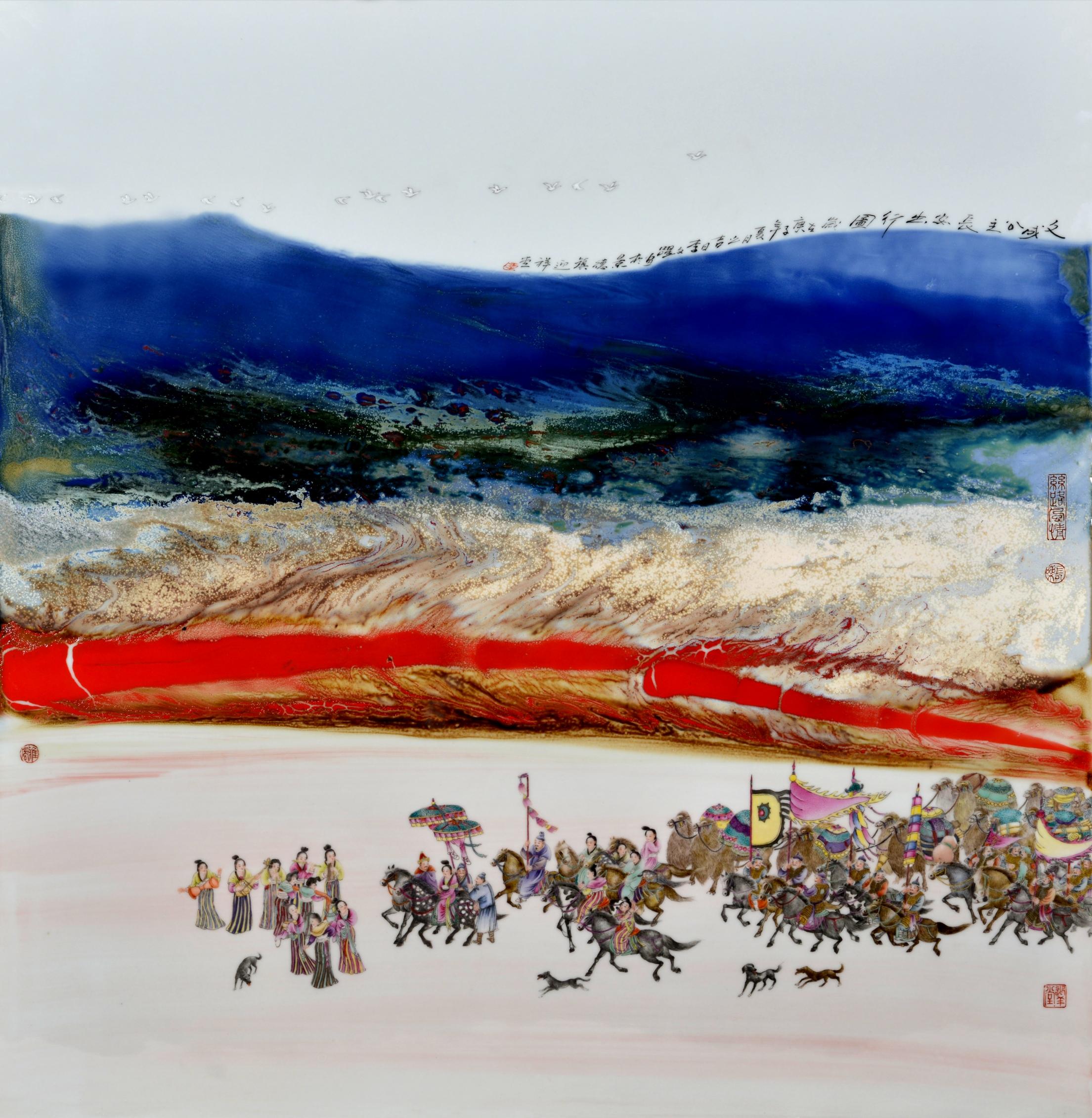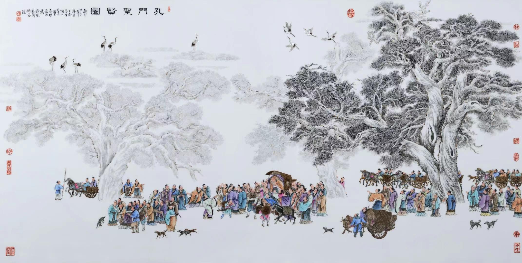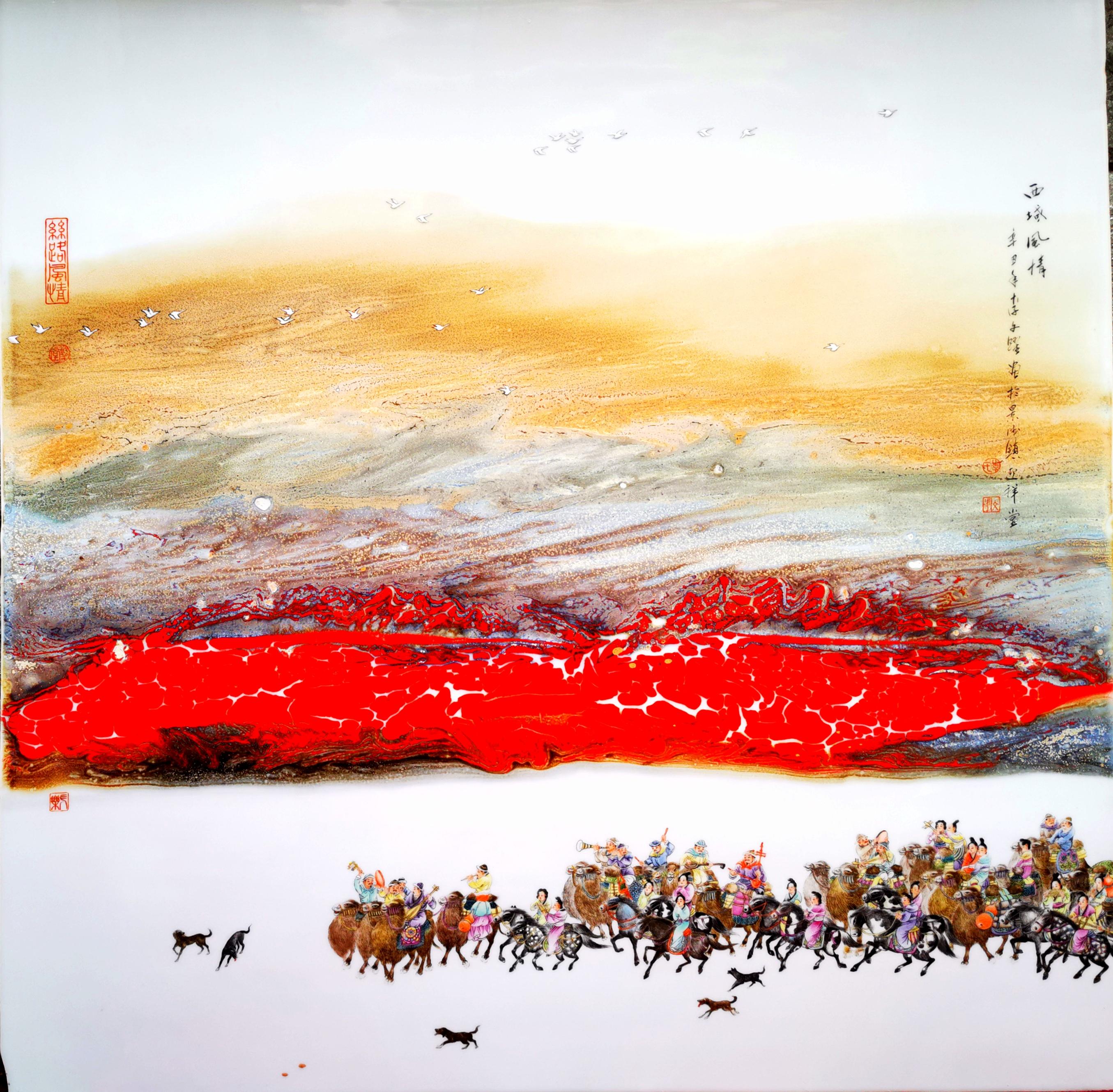 粉彩是景德镇四大传统名瓷之一,中华民族传统制瓷工艺中的珍品,被誉为“东方艺术明珠”。李文跃以其在景德镇艺术瓷厂二十八年探索实践的履历与其2002年作为陶瓷专业技术特殊人才引进江西陶瓷工艺美术职业技术学院任教,一心埋首于粉彩瓷技艺的教学、艺术创作与理论研究。可想而知,当一个人用他生命的大部分时间去苦心经营一门手艺时,这门手艺必将伴随着附着其上的对于生命的探微过程走向一种游刃有余。李文跃在扎根粉彩瓷这个专项领域的探索中,以厚重的积淀自然地抵达了技艺的精微之处。谈到一个艺术家的格局,最终必须回到他自身的创作上来,李文跃不仅在粉彩艺术探索中继承了它本身的深厚传统,同时也创新与拓展了粉彩艺术。早在1987年,李文跃曾拜墨彩老艺人雷火莲为师,从事“墨彩描金陶瓷艺术”特种工艺的创作和研究。经过几年的潜心学习,李文跃在扎实的粉彩技艺之外,又掌握了墨彩技艺。在这两种技艺的自如掌控之中,李文跃在继承传统的基础上有了自己的全新思考,他试图将粉彩装饰粉润柔和之秀雅与墨彩瓷绘艺术典雅清和的艺术特色融于陶瓷绘画表达中,创新并丰富了陶瓷绘画的语言,在传统粉彩瓷艺术的基础上开创了“粉墨彩瓷”艺术新语言,这种创新是他个人所独有的,成为他个人鲜明的艺术符号。论及艺术,必须要有思想的渗透引领艺术走向灵魂的升华,而思想应该说是一个人格局的核心。可以说,李文跃在创作中所显露的人文情怀是显而易见的。这种人文情怀的表达在陶瓷绘画创作中几近呈现出史诗的气象,对传统文化的深研使其在创作中显示出对历史与人文的反顾,并且试图在历史与当下的链条上找到能给予人启迪的衔接点。我们可以看到李文跃的创作根基中,内蕴着一种文人的气度与追根思源的回溯精神。从他深入传统的普遍的引经据典到将“孔子”文化作为一个独立题材来创作再至其西域系列题材作品的创作,无不显示出他在传统文化的浩海中所撷取的经典关联,可以说,李文跃都是紧紧环绕着我们本土文化中至关重要的部分来进行系统地关联地诠释。