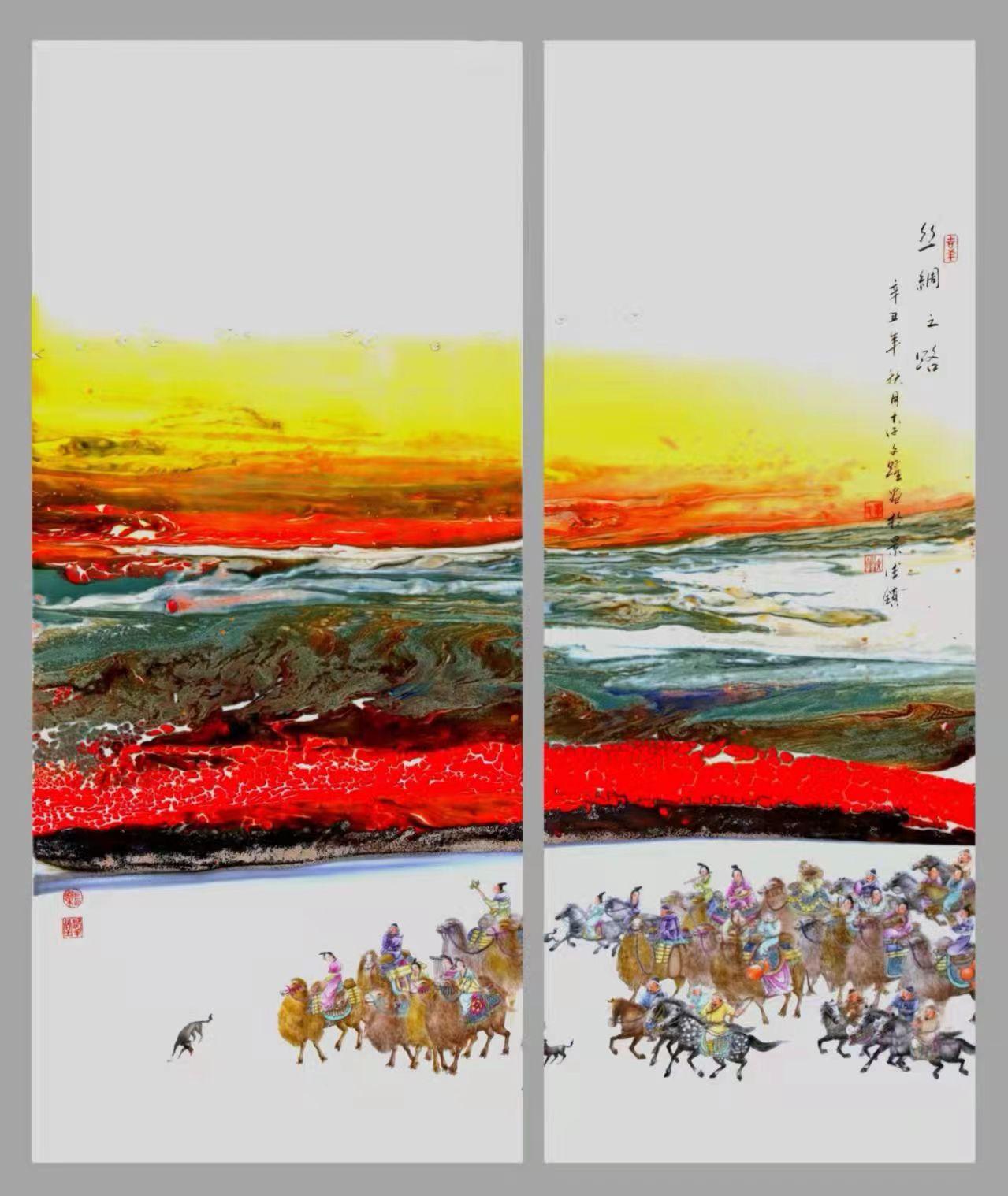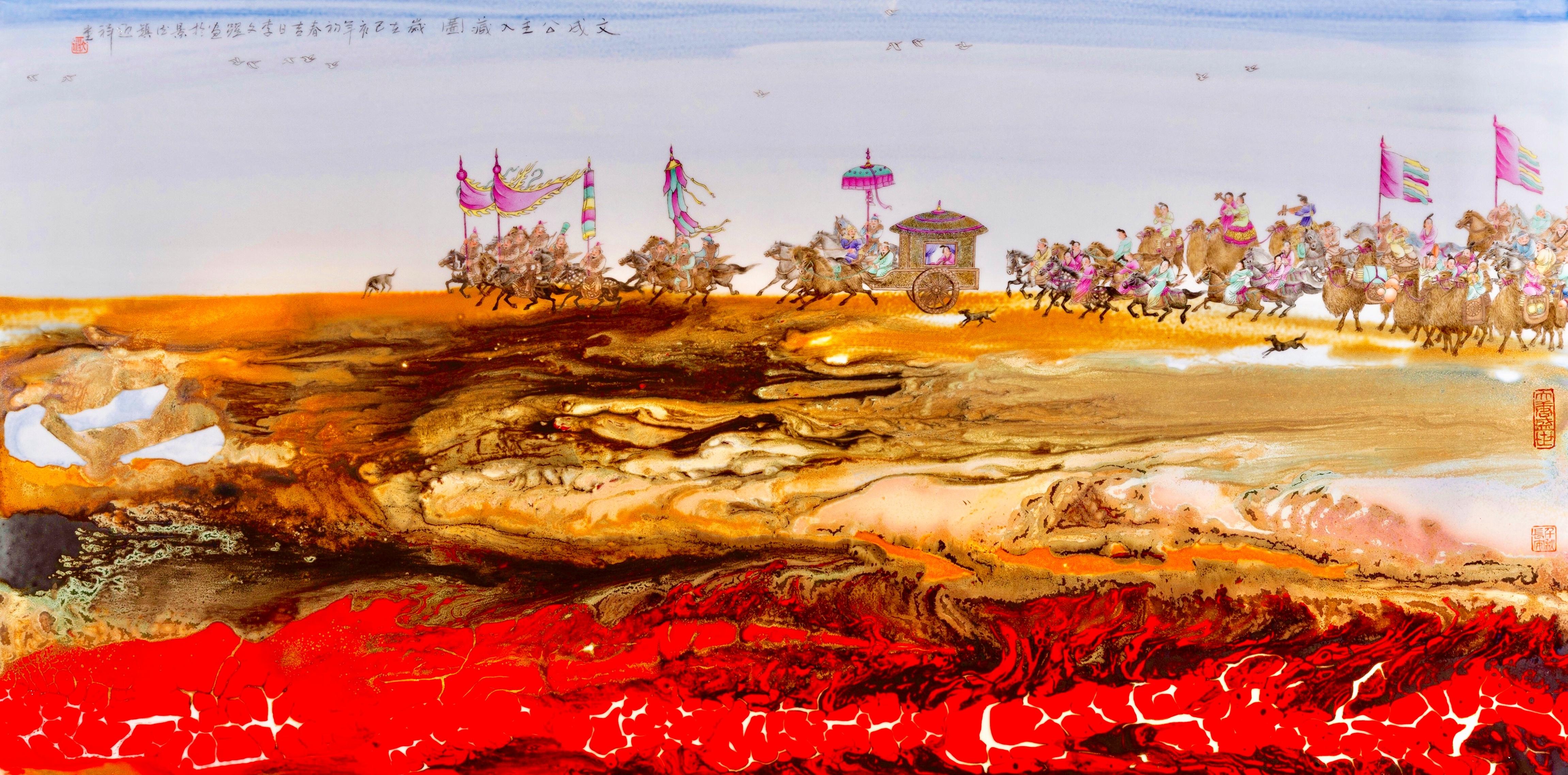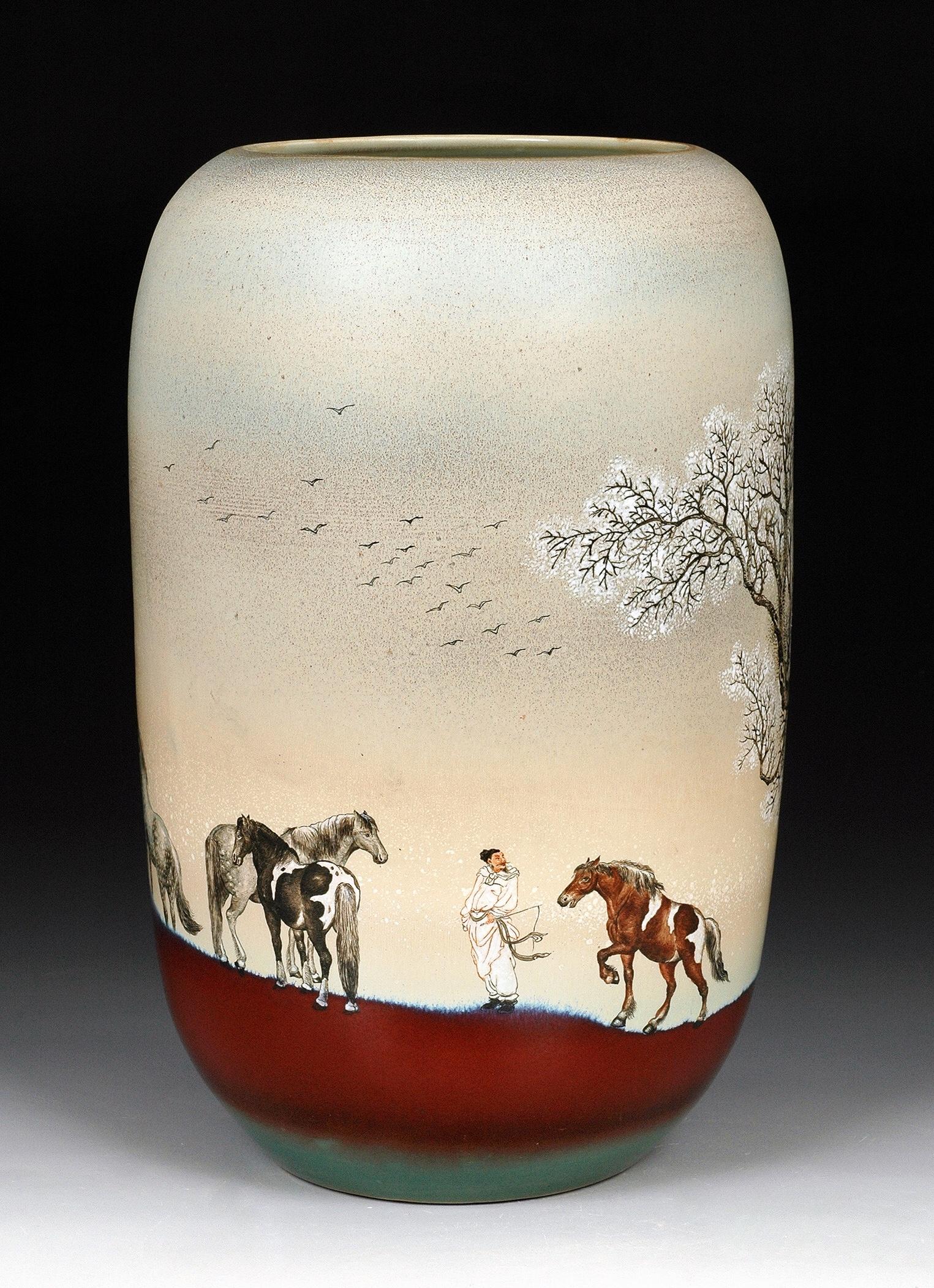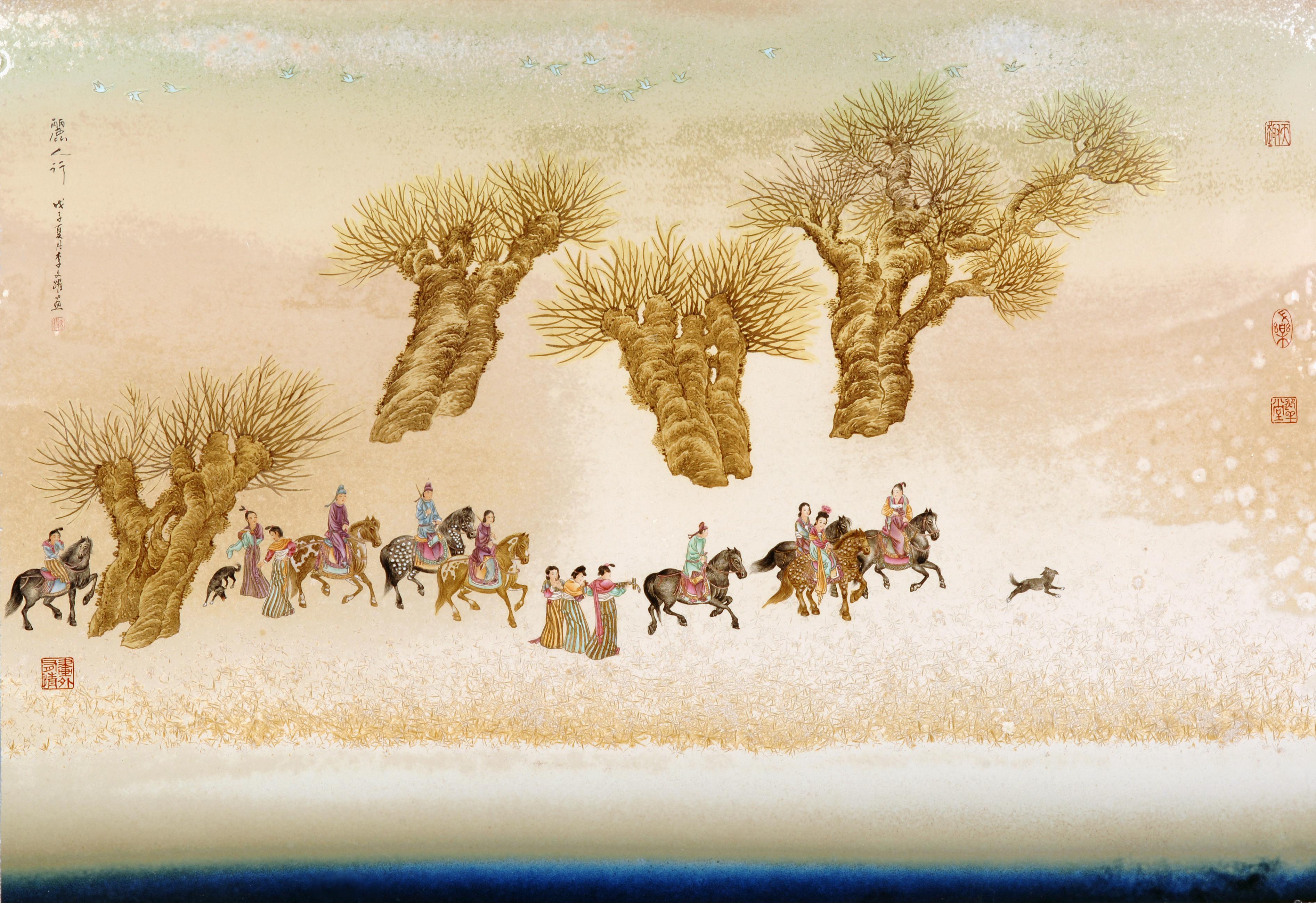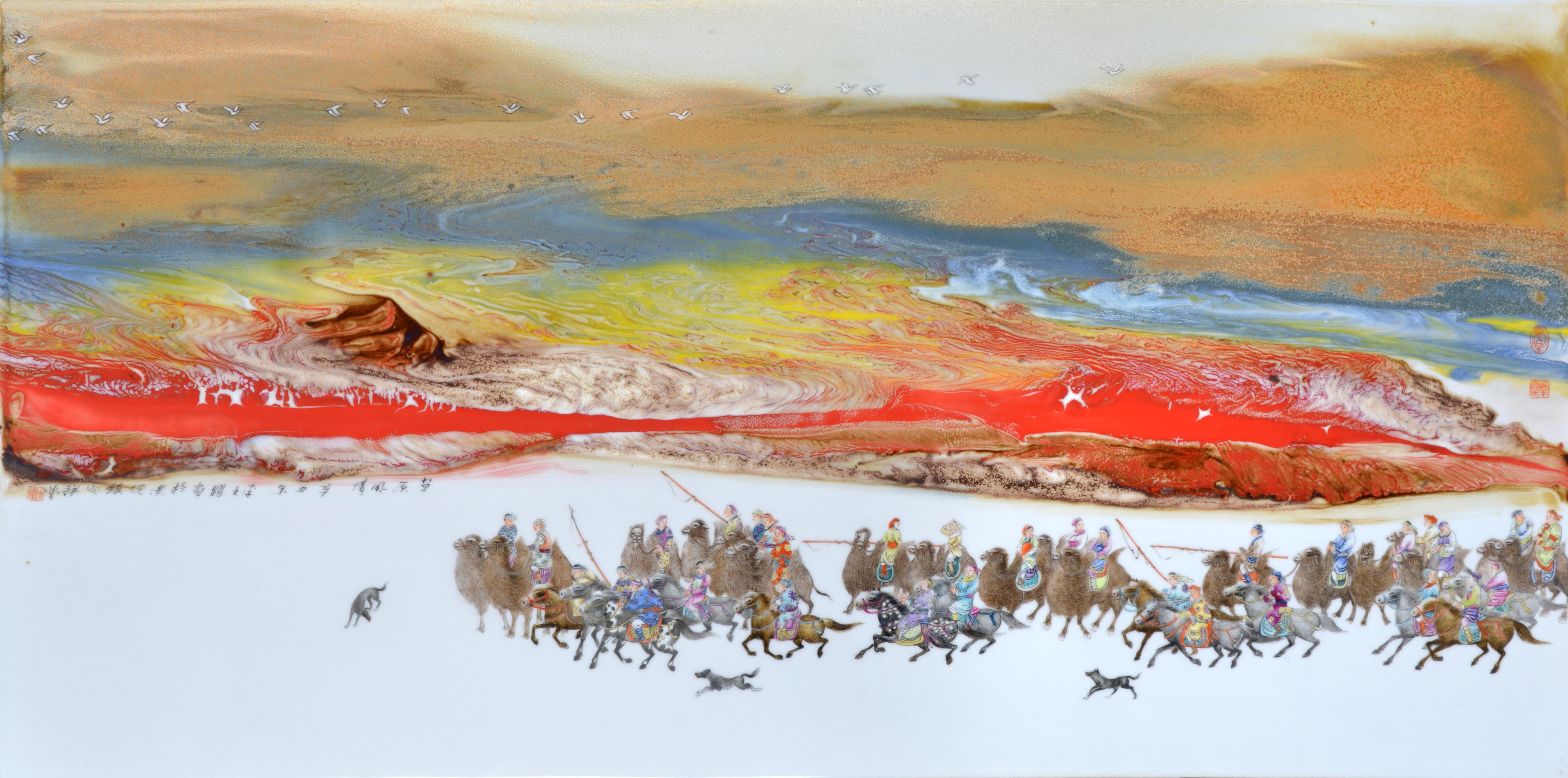 粉彩是景德镇四大传统名瓷之一,中华民族传统制瓷工艺中的珍品,被誉为“东方艺术明珠”。李文跃以其在景德镇艺术瓷厂二十八年探索实践的履历与其2002年作为陶瓷专业技术特殊人才引进江西陶瓷工艺美术职业技术学院任教,一心埋首于粉彩瓷技艺的教学、艺术创作与理论研究。可想而知,当一个人用他生命的大部分时间去苦心经营一门手艺时,这门手艺必将伴随着附着其上的对于生命的探微过程走向一种游刃有余。李文跃在扎根粉彩瓷这个专项领域的探索中,以厚重的积淀自然地抵达了技艺的精微之处。谈到一个艺术家的格局,最终必须回到他自身的创作上来,李文跃不仅在粉彩艺术探索中继承了它本身的深厚传统,同时也创新与拓展了粉彩艺术。早在1987年,李文跃曾拜墨彩老艺人雷火莲为师,从事“墨彩描金陶瓷艺术”特种工艺的创作和研究。经过几年的潜心学习,李文跃在扎实的粉彩技艺之外,又掌握了墨彩技艺。在这两种技艺的自如掌控之中,李文跃在继承传统的基础上有了自己的全新思考,他试图将粉彩装饰粉润柔和之秀雅与墨彩瓷绘艺术典雅清和的艺术特色融于陶瓷绘画表达中,创新并丰富了陶瓷绘画的语言,在传统粉彩瓷艺术的基础上开创了“粉墨彩瓷”艺术新语言,这种创新是他个人所独有的,成为他个人鲜明的艺术符号。论及艺术,必须要有思想的渗透引领艺术走向灵魂的升华,而思想应该说是一个人格局的核心。可以说,李文跃在创作中所显露的人文情怀是显而易见的。这种人文情怀的表达在陶瓷绘画创作中几近呈现出史诗的气象,对传统文化的深研使其在创作中显示出对历史与人文的反顾,并且试图在历史与当下的链条上找到能给予人启迪的衔接点。我们可以看到李文跃的创作根基中,内蕴着一种文人的气度与追根思源的回溯精神。从他深入传统的普遍的引经据典到将“孔子”文化作为一个独立题材来创作再至其西域系列题材作品的创作,无不显示出他在传统文化的浩海中所撷取的经典关联,可以说,李文跃都是紧紧环绕着我们本土文化中至关重要的部分来进行系统地关联地诠释。