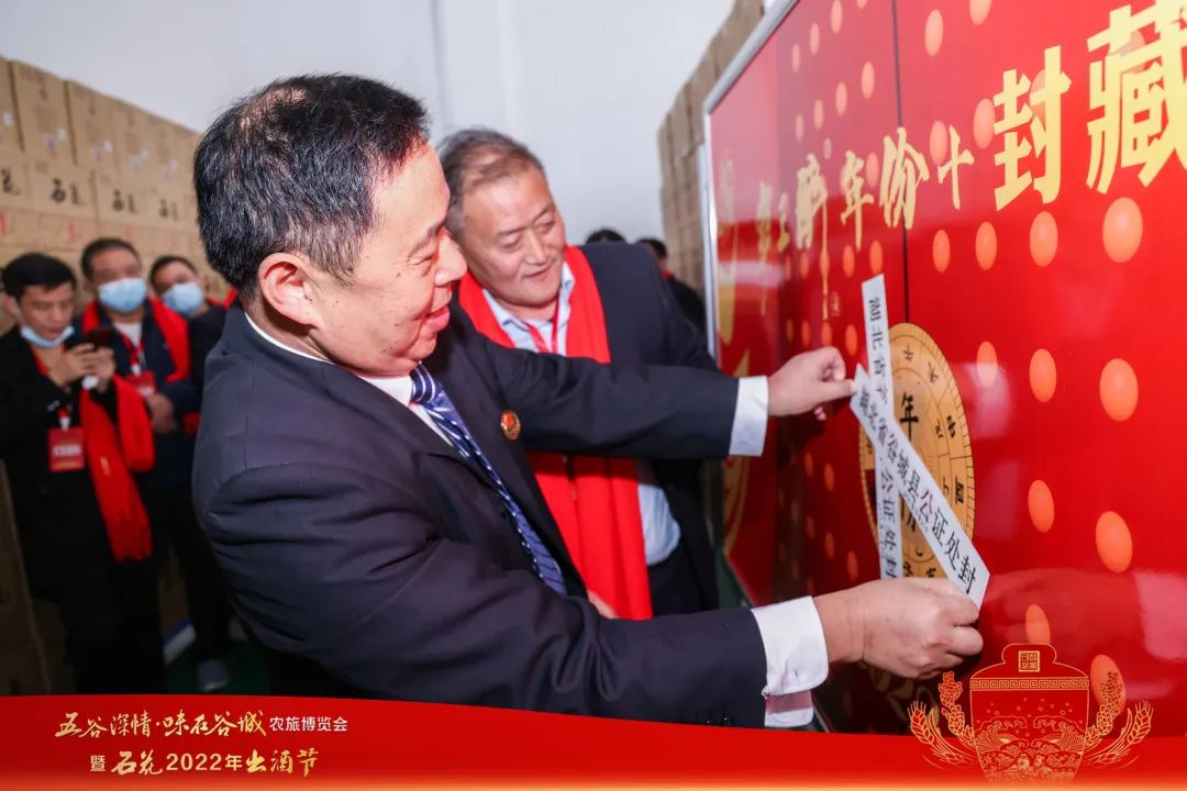 随着黄德强的一声吆喝,五坛装有100斤精心甄选的新酿上好原浆酒被正式封藏。同时,五坛在石花酒业生态白酒庄园窖藏20年的100斤装霸王醉原浆酒进行启封开坛。