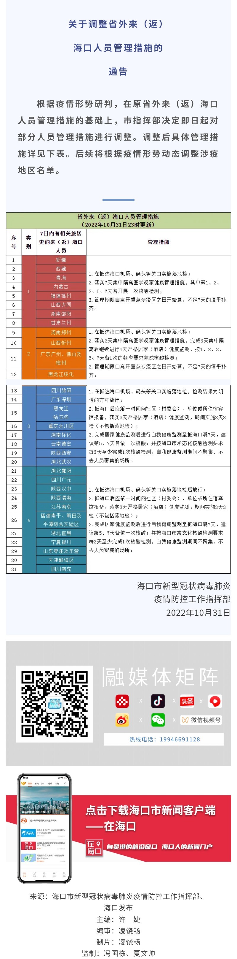 关于调整省外来(返)海口人员管理措施的通告(10月31日23时更新)