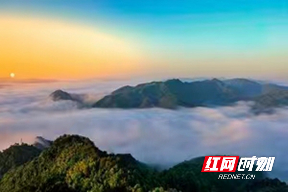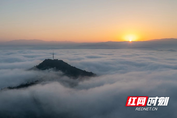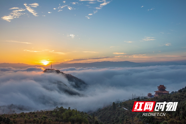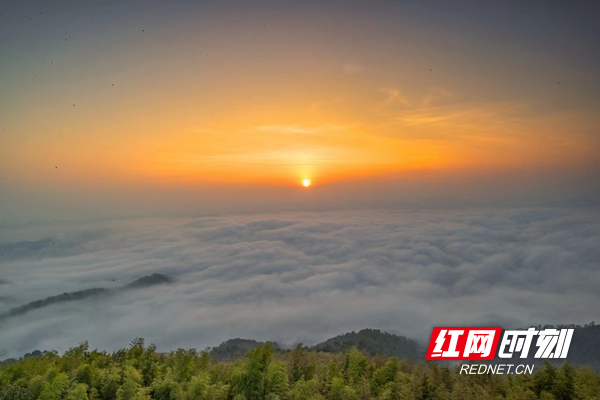近日,天气晴朗,洪江区境内的湖南嵩云山国家森林公园出现了云海日出美景,吸引了不少摄影爱好者和游客欣赏拍摄。