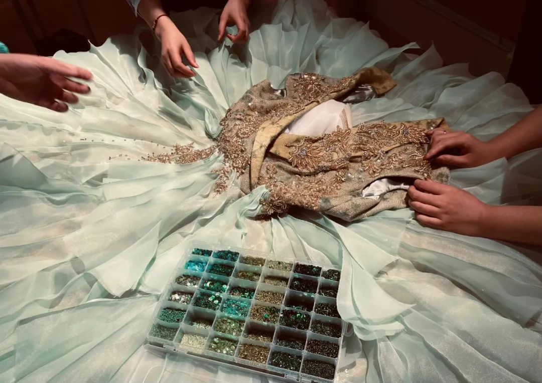 细密的金线穿过丝帛,勾勒出双栖双飞群雁的轮廓。圆润的珍珠在指尖滑过,银色的丝线轻盈地穿过它的孔洞,编织出春色摇曳的四月朝阳。28岁的张彦钉上最后一颗珍珠,他揉了揉眼睛,将绣好的衣服抖开仔细检查。这是他在2022中国国际时装周上即将首发的一套衣服,他为这场大秀起名为“昆仑听雪”。为了这场大秀,张彦和团队的工作人员已经忙活了几个月。