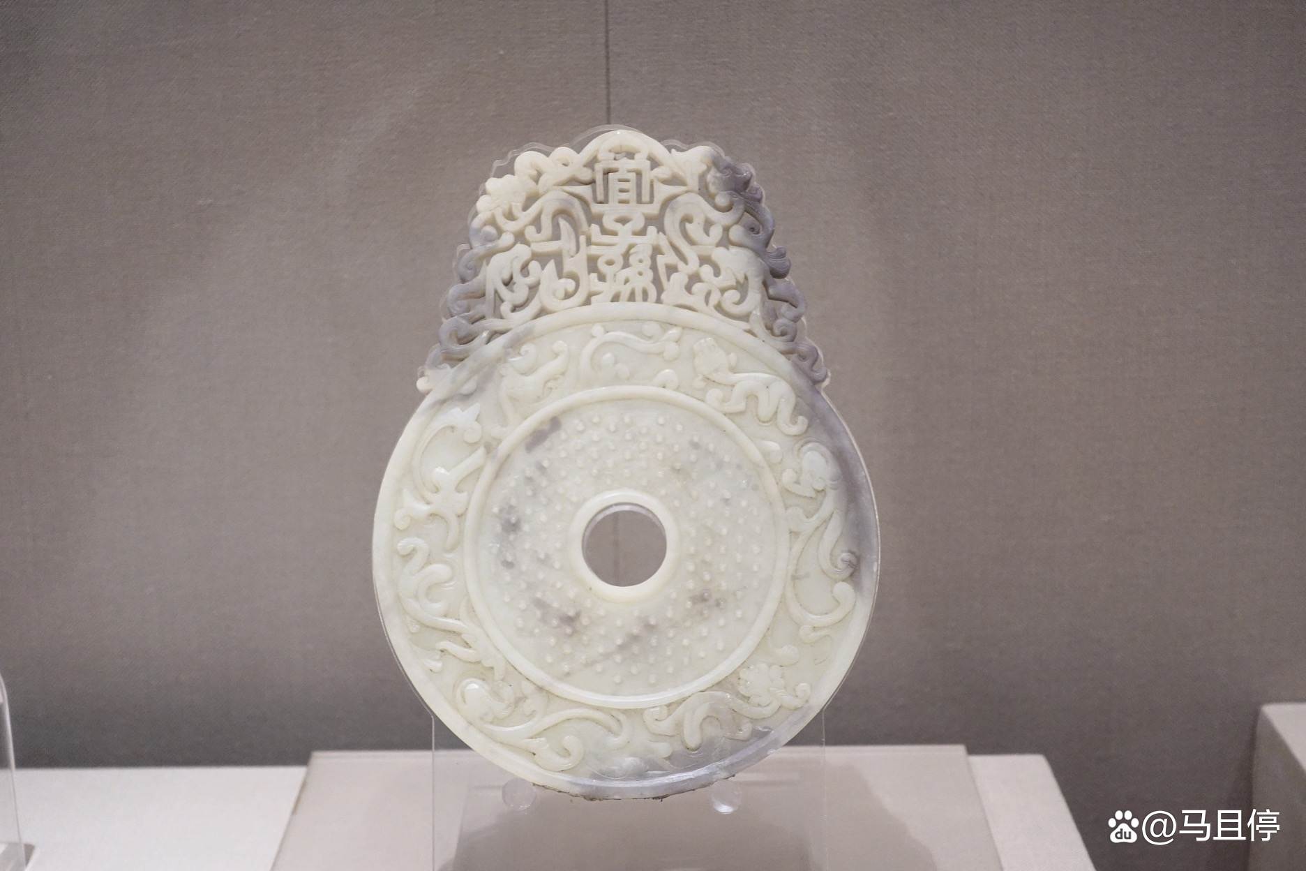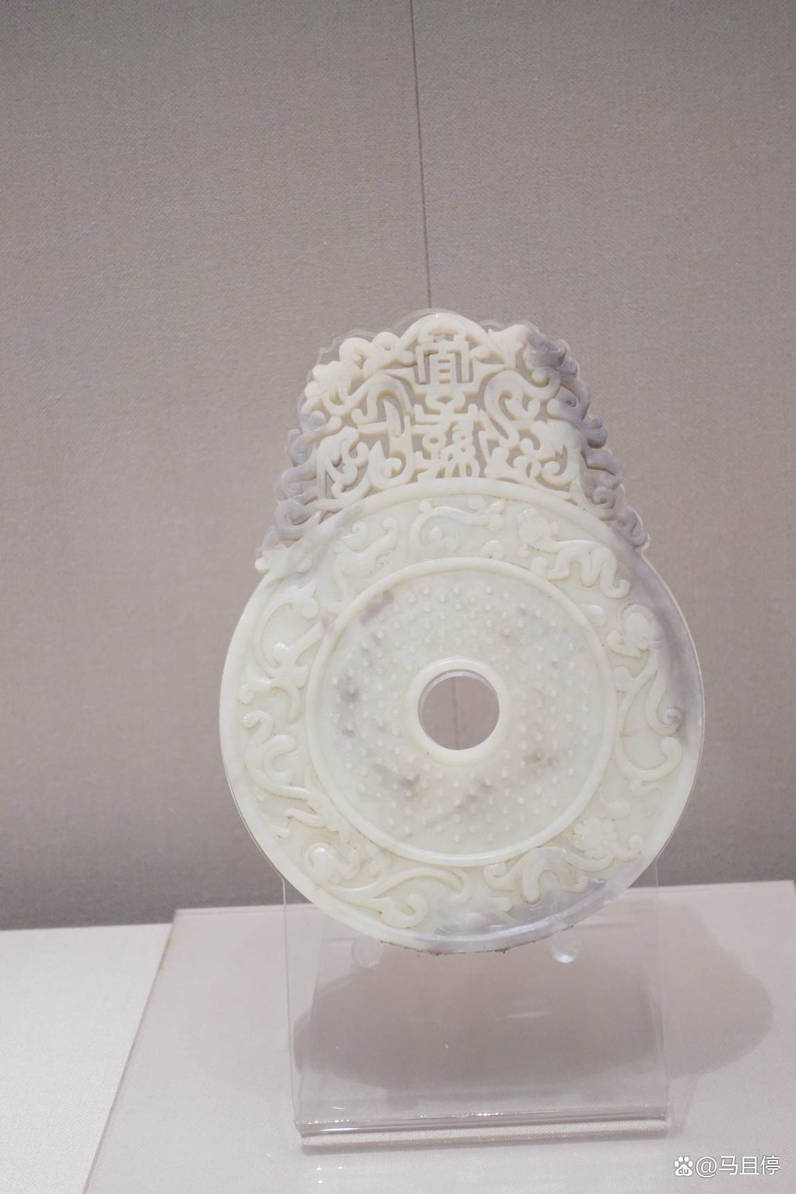 首先来看看这款国家一级文物-东汉的“宜子孙”玉璧,它出土于青州谭坊镇马家冢子东汉墓。细细来看这款玉器,整体为白色,中间间有墨色,这样润色的材质在中国出土的玉壁中可谓非常罕见。