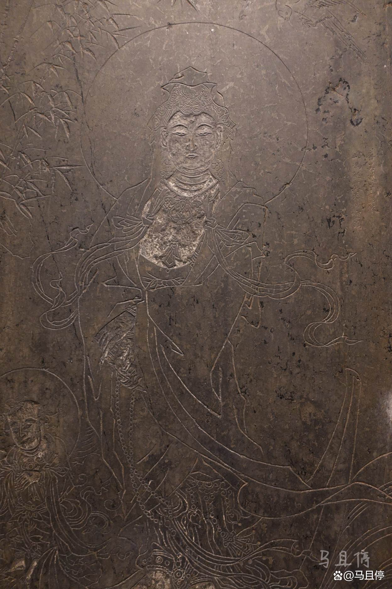 首先来看看这款明代观音菩萨像石刻,它是以唐代画家吴道子的原画作为模版临摹雕刻而成。在菩萨旁边还可以看到“唐吴道子画像,明冯起震添竹重镌刻”的题字。