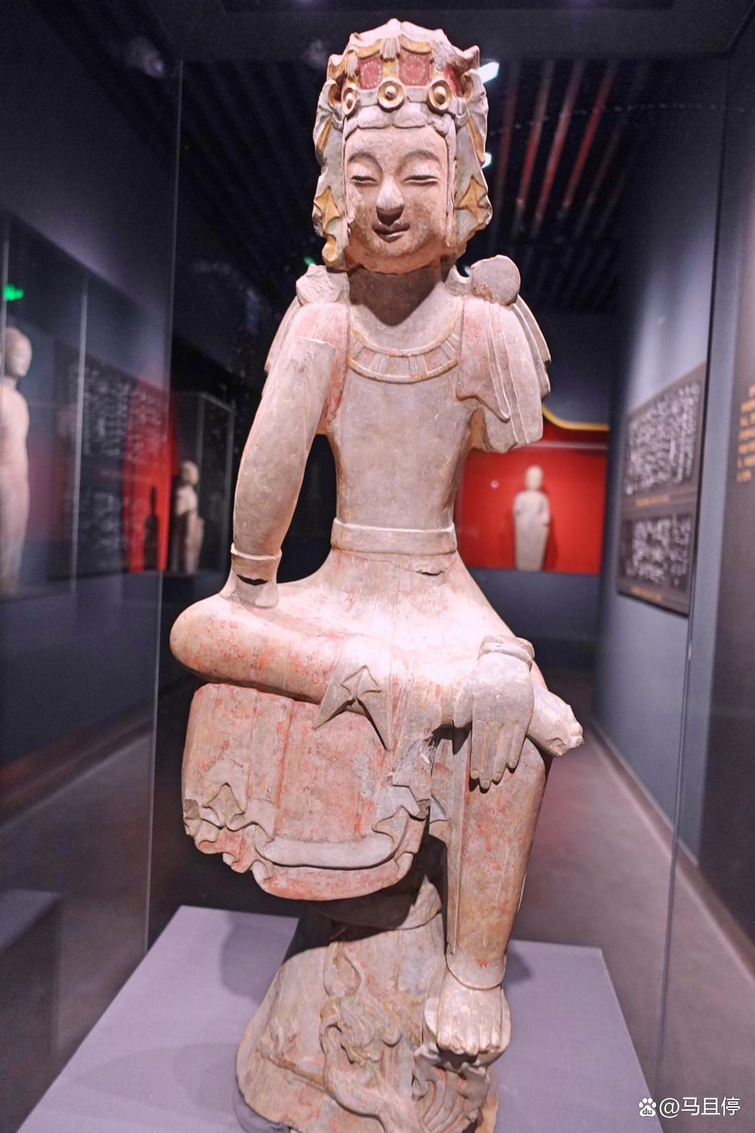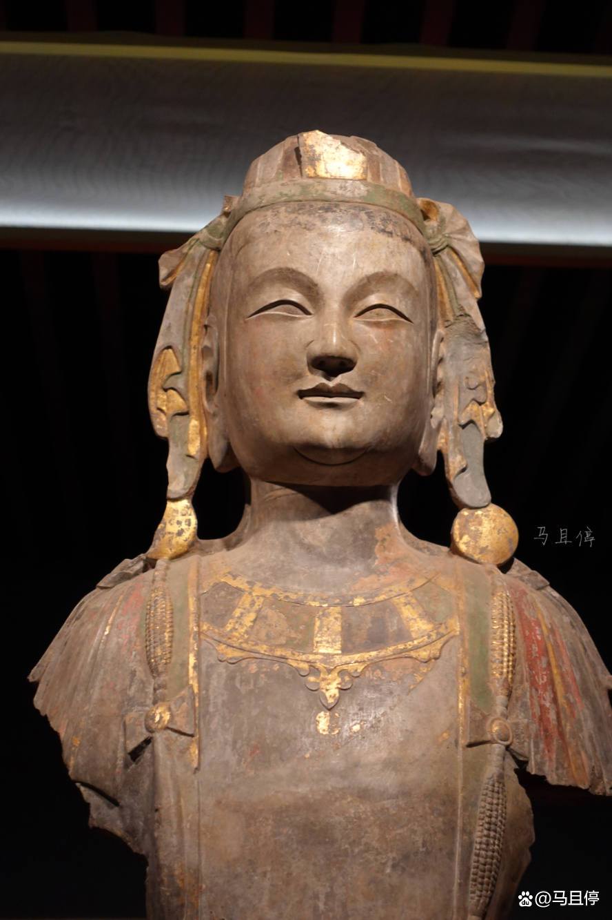 这尊贴金彩绘石雕菩萨是龙兴寺北魏造像中最精美的一尊,通高约165厘米,材质为石灰石质。菩萨头戴雕花的华丽宝冠,眉清目秀,双目低垂,庄严中又带着典雅。