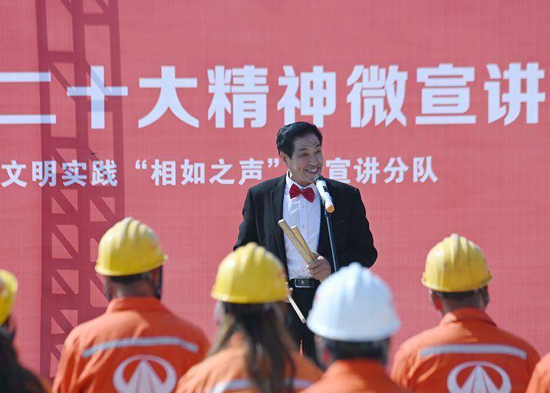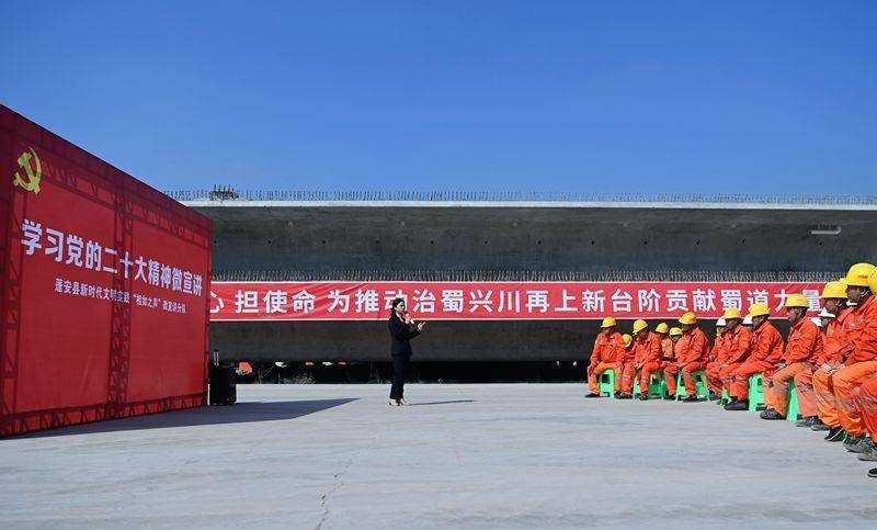 “竹板打得呱呱响,二十大精神听我讲。非凡十年不一般,瞩目成就人人夸……”11月1日上午,在汉巴南铁路南充至巴中段蓬安制梁场,一场学习党的二十大精神微宣讲活动正在进行,工人们一边手持党的二十大报告宣传小册子,一边欣赏该县新时代文明实践“相如之声”微宣讲分队文化志愿者表演的快板节目。